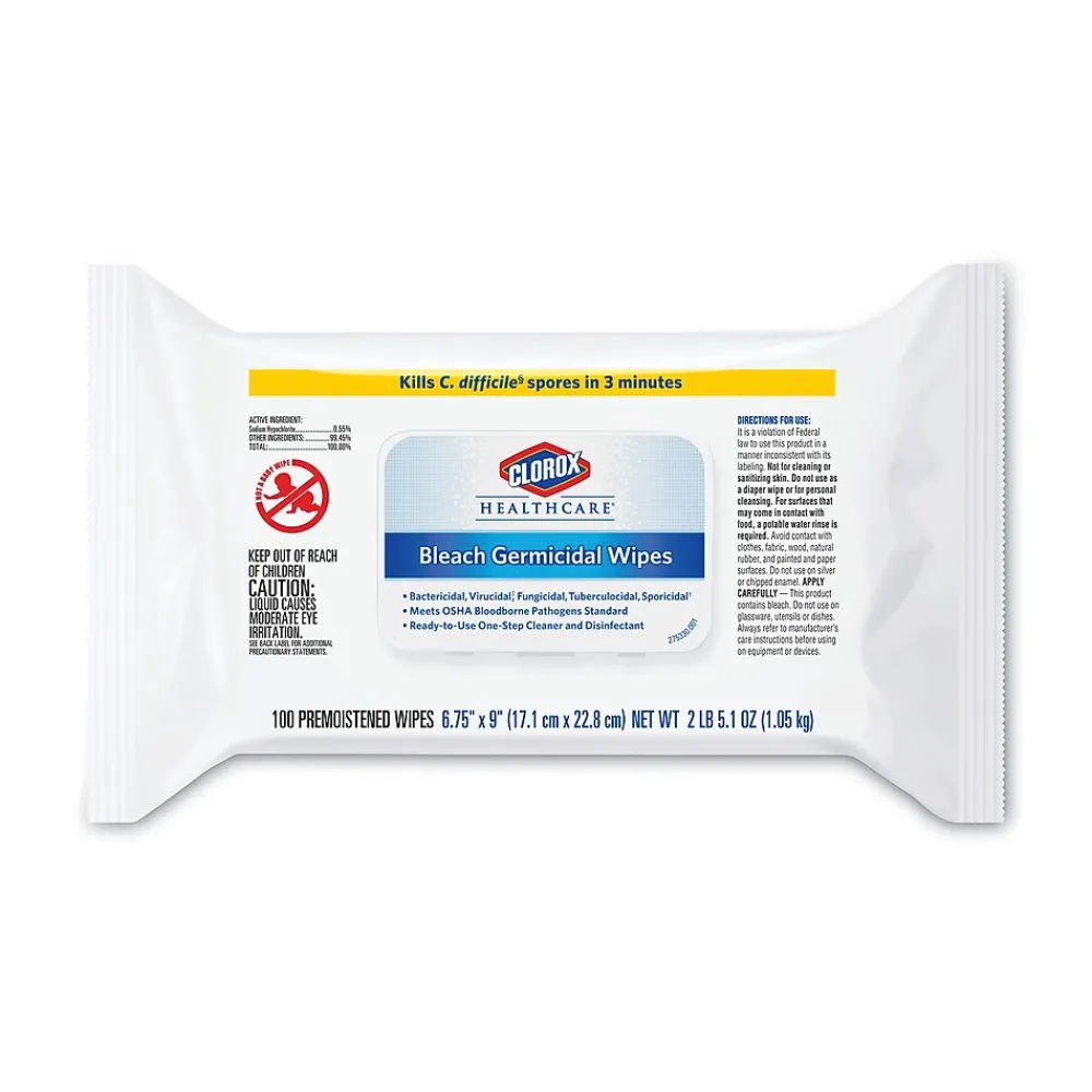 Healthcare professionals trust Clorox Healthcare Bleach Germicidal Wipes to help them overcome infection control challenges in a constantly changing healthcare environment. Clorox Healthcare Bleach Germicidal clinical wipes are ready to use, 1 step cleaner containing a 1:10 bleach dilution to meet CDC and OSHA guidelines for disinfecting surfaces in healthcare settings. Designed for daily disinfection, high-touch surfaces and medical equipment. These wipes are EPA registered to kill a total of 58 microorganisms, including HAI causing bacteria like MRSA and VRE in 30 seconds, outbreak causing viruses such as Influenza A and B viruses, Measles virus and Norovirus in 1 minute and C. difficile spores, TB and fungi in 3 minutes. These wipes kill 99.9999% of C. difficile spores, according to the current EPA recommended testing standard (June 2014). These wipes are engineered minimize residue and leave less visible residue on surfaces vs. competitor bleach wipes. They are formulated with an anticorrosion agent and are compatible with common healthcare surfaces including stainless steel, glass, plastic, porcelain, glazed ceramic, laminated surfaces and vinyl. Intended for use in healthcare settings.