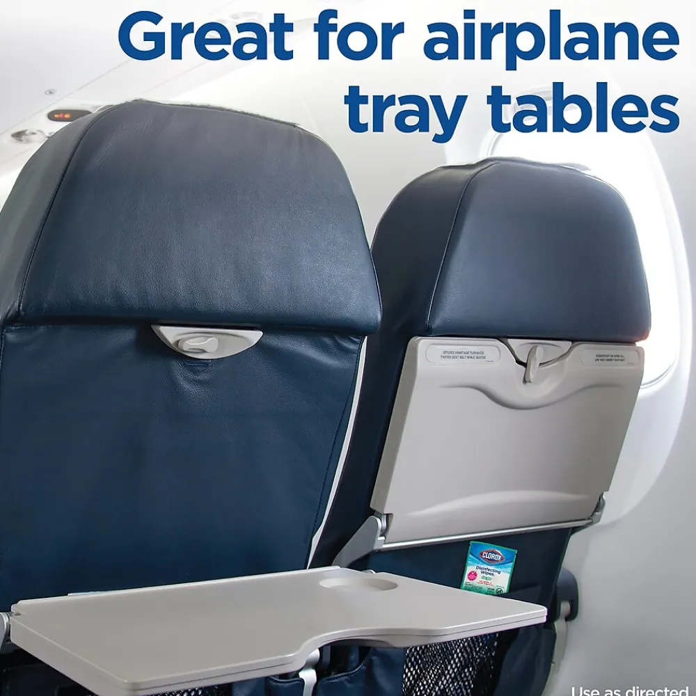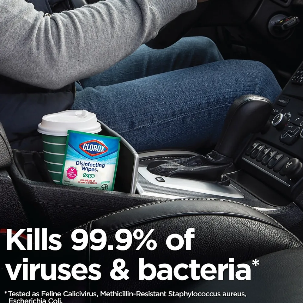 Clorox® Disinfecting Wipes1 To Go clean, disinfect and remove allergens* for 5x cleaning power* and leave a clean fresh scent. Take disinfecting on the go — in your car, purse, gym bag, carry-on or desk drawer —with these Clorox® wipes that kill 99.9% of viruses* and bacteria, including COVID-19 virus*, staph, E. coli, MRSA, salmonella, strep and Kleb. These travel packs of disposable wipes remove common allergens*, clean messes and kill germs* on surfaces like shopping carts, airplane tray tables , public bathroom surfaces, cell phones, gym equipment and more. They can even prevent the growth of odor-causing bacteria* for up to 24 hours. These bleach-free wipes are safe to use on finished wood, sealed granite and stainless steel. Disinfecting Wipes are also great on non-food-contact surfaces in the home, office, classroom, pet area, dorm and locker room. *Removes tough stains, cuts through grease, deodorizes, removes allergens (including pet dander, dust mite matter, pollen particles and grass) and removes soap scum. Kills SARS-CoV-2 on hard, nonporous surfaces. Kills human Coronavirus, Influenza A2 Virus, Pseudomonas aeruginosa, Salmonella enterica Staphylococcus Aureus. Kills odor-causing bacteria on non-food contact surfaces. Allow product to air dry. Use as directed.