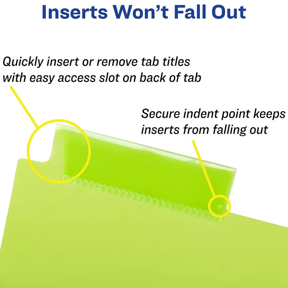 Easily organize school subject binders, recipe binders, office binders and more with Avery plastic page dividers for 3 ring binders. The wide design works perfectly with sheet protectors so that you can still view your tabs at a glance. This pack includes 1 set of 5-tab insertable dividers in a range of different colors for easy color coding at a glance. 2 pockets are attached to every divider for extra storage for loose sheets. Each divider is made with a durable plastic material that will last longer than standard paper dividers and wipes clean with most non-abrasive household cleaners. The insertable Big Tab divider tabs are 50% larger than traditional divider tabs and provide extra space for text, logos and images. Each tab also includes an easy access slot to make it simpler to slide tab inserts in and out as well as an indented point to keep the inserts locked in place. A sheet of tab inserts are included that can be printed on with either a laser or inkjet printer and can be written on with pens, permanent markers and pencils. Visit the Avery site for free templates and tools to easily design and print custom tab inserts for any project whether it’s for school, home or work.