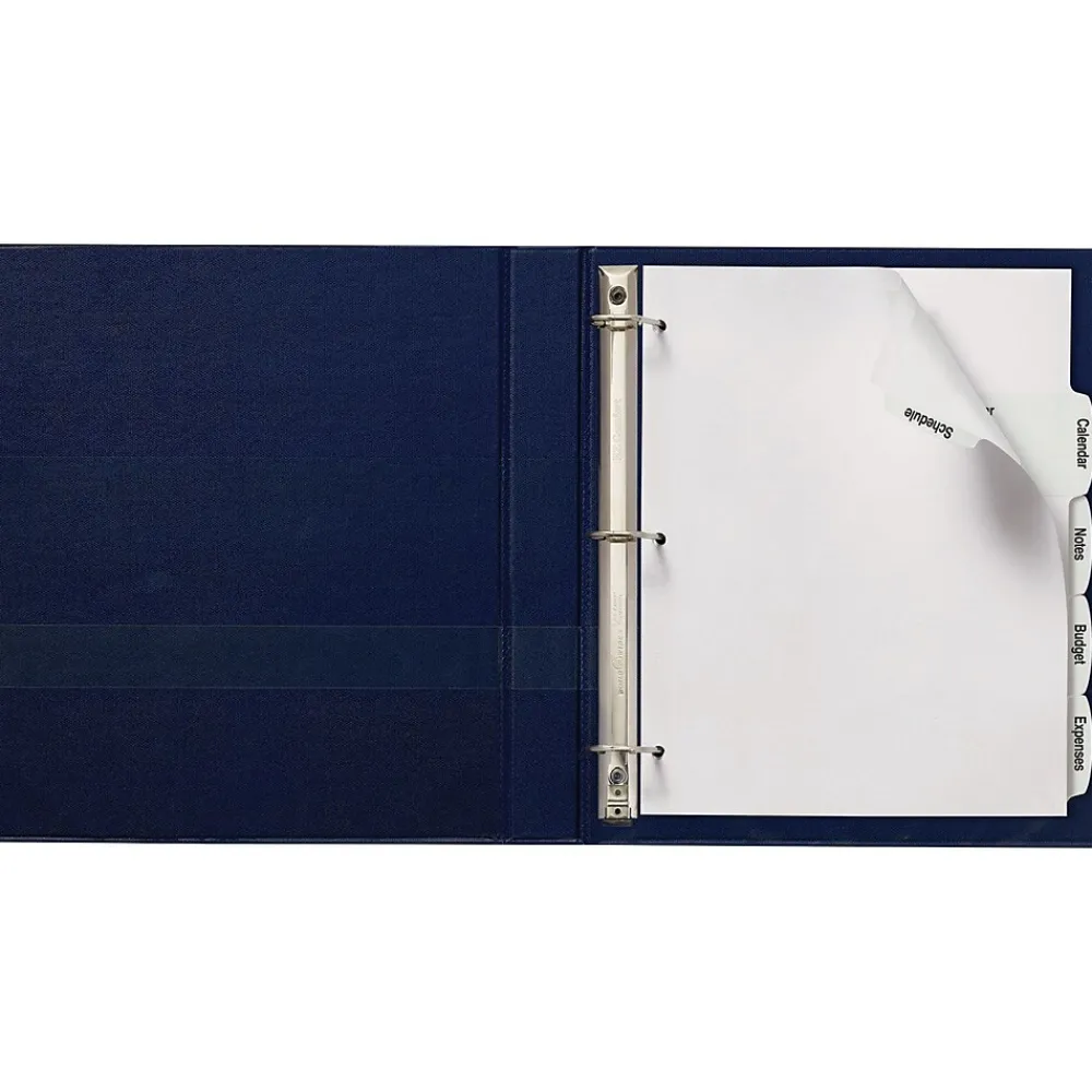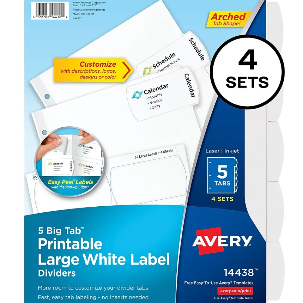 Create customized dividers with all the information you need, using these Large White Label Tab Dividers. The large labels extend from the arched-shaped tabs onto the divider bodies, giving ample room to add section contents, logos or designs. Simply personalize your tab labels using our free templates and designs at avery.com/print. You can print your labels in black and white, or create a custom color set, using a laser or inkjet printer. The print-to-the-edge Easy Peel(R) labels, featuring our Pop-Up Edge(R), make it fast and simple to personalize your tabs, with no inserts required. You simply bend back the label sheet, peel your label and apply to the divider tabs. A bonus standard label sheet is included for the back of your tabs.