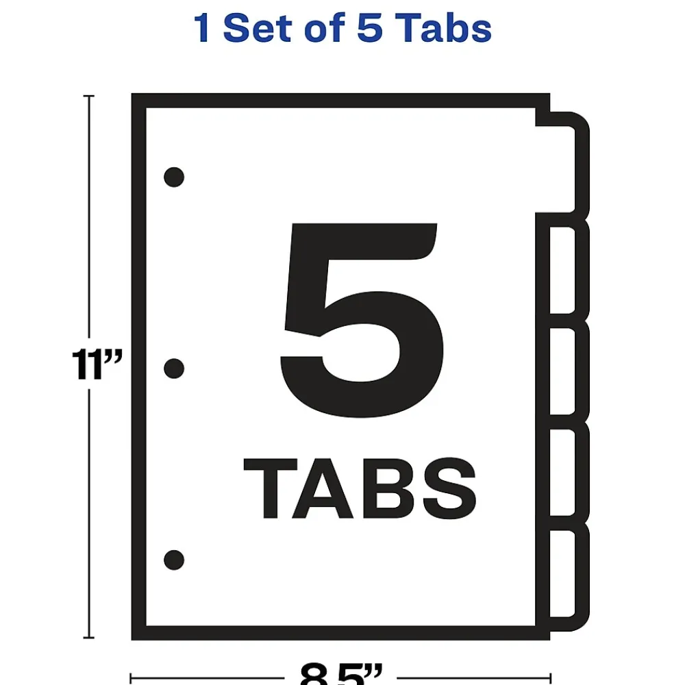 Don’t waste time and money ordering custom printed binder dividers with tabs when you can easily create and print your own personalized dividers with Avery Index Maker Clear Label Big Tab Dividers. Our larger Big Tab design offers more room for bigger fonts, more text and even logos or images. Customize your title tabs quickly and easily using the free templates on the Avery website and print with your inkjet or laser printer for clean, professional looking results in minutes. This pack comes with one set of 5-tab dividers, and the Easy Apply clear label strips make it simple to apply all 5 labels at once. Just print, align labels against tabs, smooth down labels and peel up strip. Each 3-hole punched durable divider also features doubled-sided, reinforced tabs and edges to help resist tearing for long-lasting, everyday use. These 3 ring binder dividers with tabs are a great addition to your medical office supplies, school binders, personal organizers, tax office supplies, presentation reports and more. Print, peel, and press your way to a perfect, precise project.