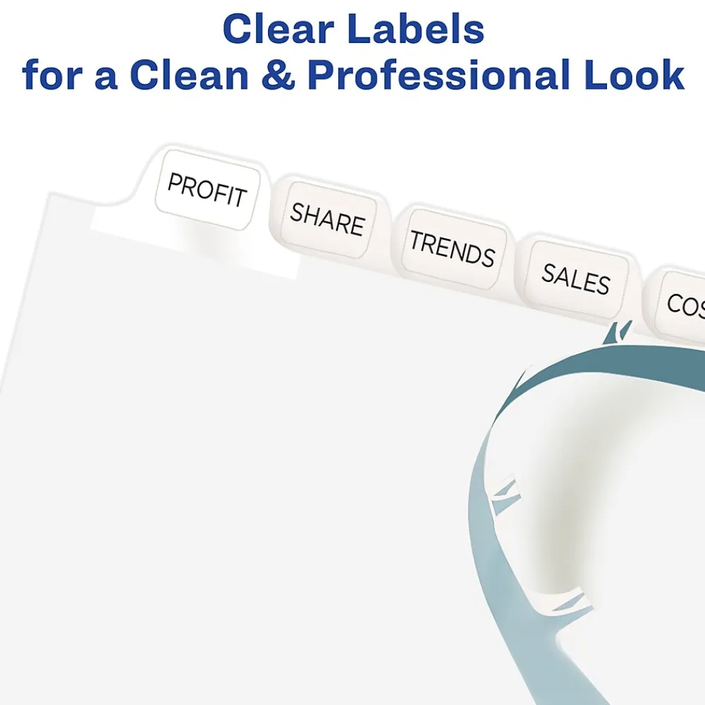 - Get a professional, printed-on look with clear labels that virtually disappear on the white divider tabs