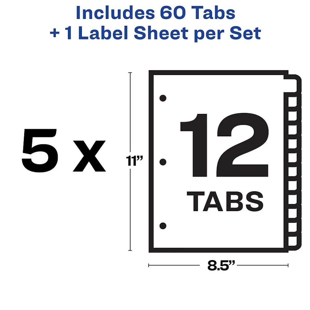 - Label all 12 tab dividers at once with the Index Maker Easy Apply Label strip that results in five perfectly aligned sets of tabs