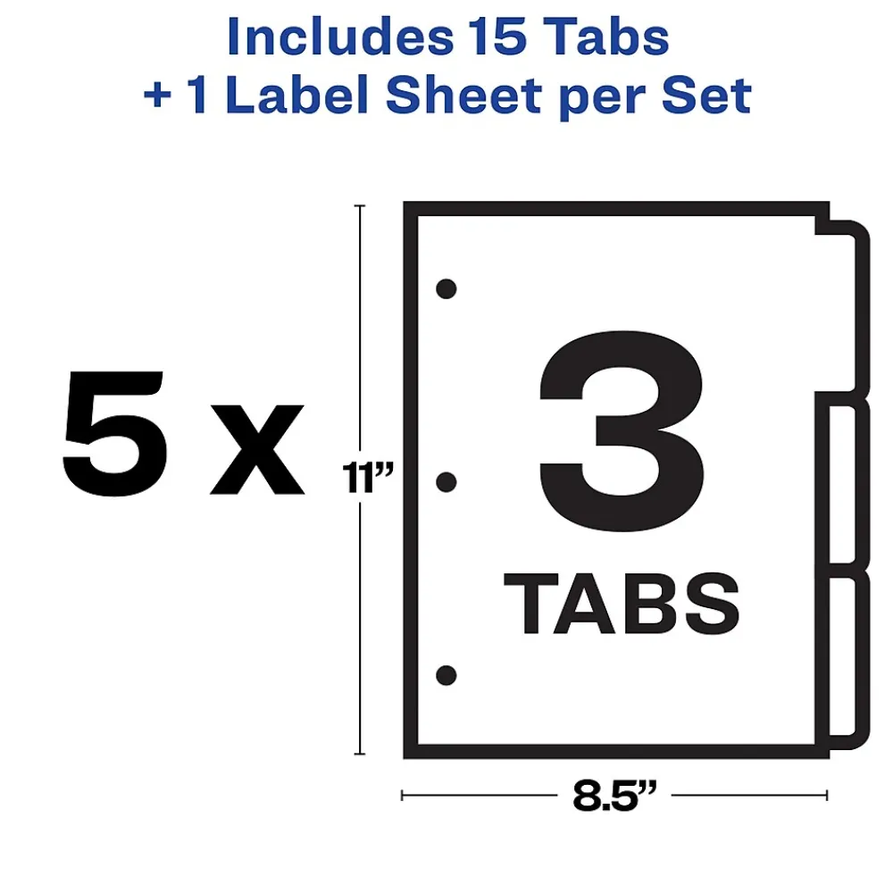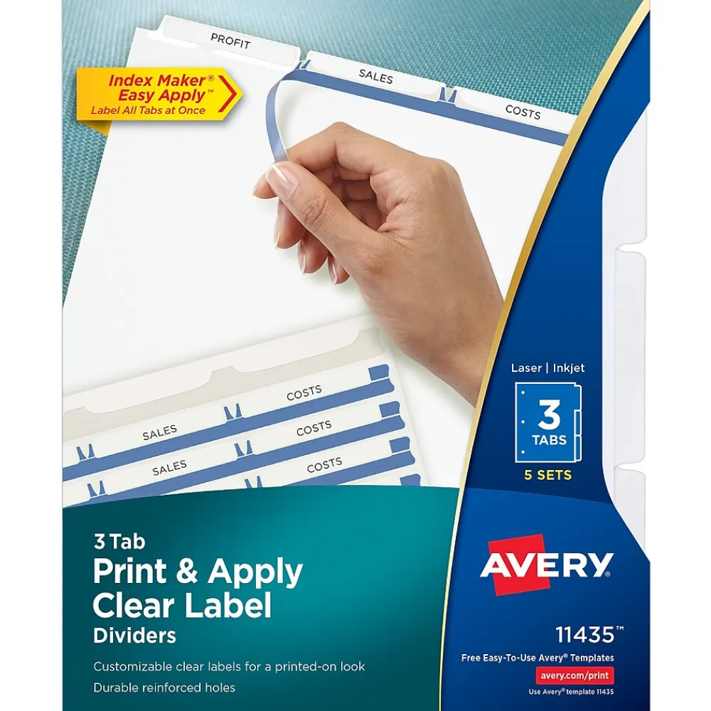 Dividers|Avery Index Maker Paper Dividers with Print & Apply Label Sheets, 3 Tabs, White, 5 Sets/Pack (11435)