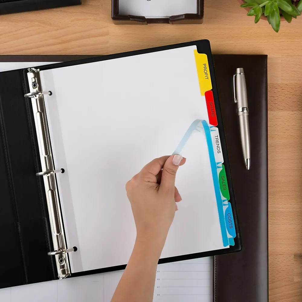 - Get a professional, printed-on look with clear labels that virtually disappear on the multicolor divider tabs