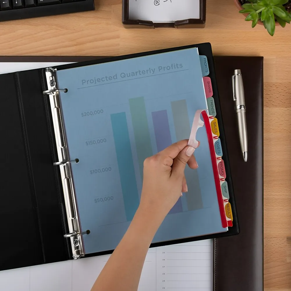 - Get a professional, printed-on look with clear labels that virtually disappear on the multicolored divider tabs