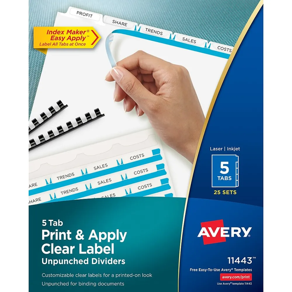 Don’t waste time and money ordering custom printed binder dividers with tabs for your bound documents when you can easily create and print your own personalized dividers with Avery Index Maker Clear Label Unpunched Dividers. The unpunched edge of these dividers can accommodate all binding styles, making them perfect for finance reports, curriculum notebooks, medical guides, business plans and more. Customize your title tabs quickly and easily using the free templates on the Avery website and print with your inkjet or laser printer for clean, professional looking results in minutes. This pack comes with 25 sets of 5-tab dividers, and the Easy Apply clear label strips make it simple to apply all 5 labels of each set at once. Just print, align labels against tabs, smooth down labels and peel up strip. Each durable divider also features doubled-sided, reinforced tabs to help resist tearing. These binder dividers with tabs are a great addition to your medical office supplies, personal organizers, tax office supplies, presentation reports and more. Print, peel, and press your way to a perfect, precise project.