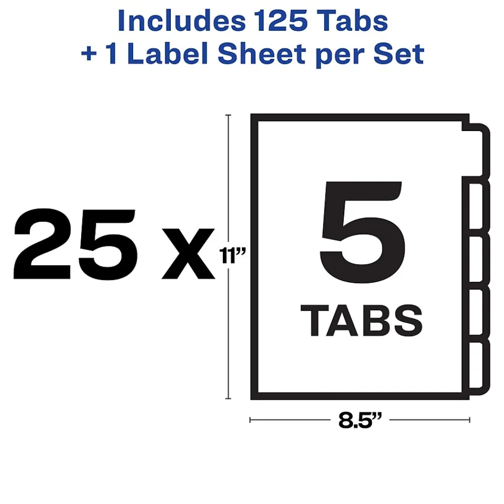 - Label all 5 tab dividers at once with the Index Maker Easy Apply Label strip that results in 25 perfectly aligned sets of tabs