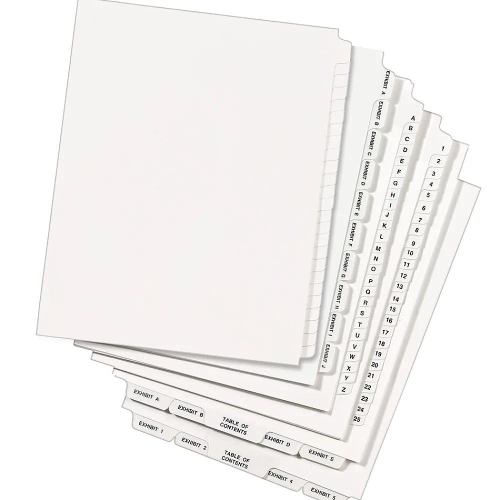 Index briefs, legal exhibits, mortgage documentation files and more. Use Avery 11959 Blank Tab Legal Exhibit Binder Dividers alone or combine with preprinted legal exhibit index dividers for easy customization of your documents. Blank, unlaminated tabs on white paper stock. You can write directly on the white tabs with a ballpoint pen or pencil, and erase easily when you’re ready to reuse and repurpose your tab dividers for the next project. The binding edge is unpunched so these dividers can fit practically any binding system. Pack contains one Standard Collated 25-Tab set.