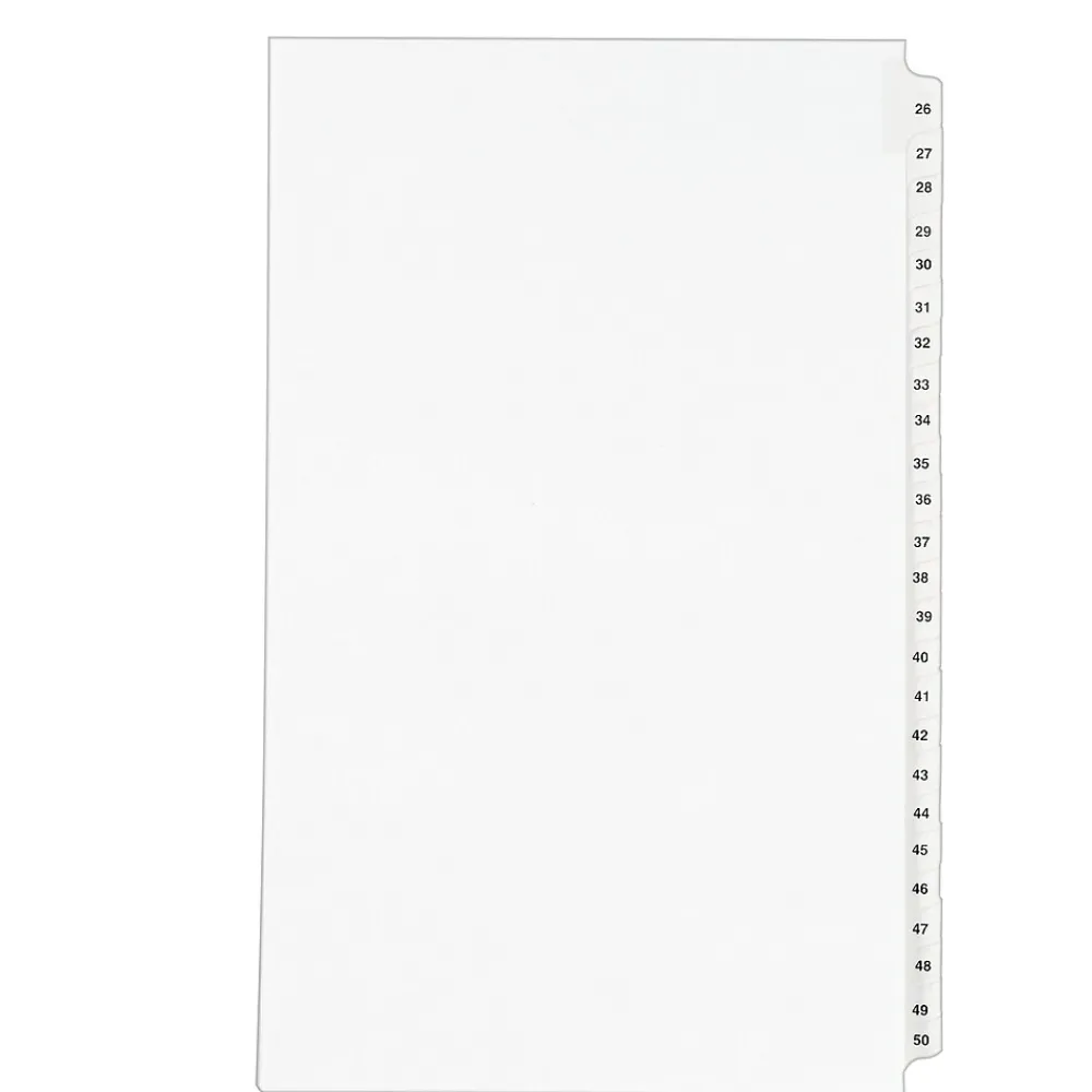 You have the right to organized and professional-looking files. This Standard Collated Legal Divider Set features Tabs 26-50 so it’s perfect for index briefs, legal exhibits, mortgage documentation files and more. 8-1/2″ x 14″ white paper stock with clear, Rip Proof(TM) reinforced tabs are preprinted on both sides using Helvetica bold type for ease of use, and the unpunched binding edge gives you the freedom to fit practically any binding system. Here’s evidence these dividers will do your files justice.