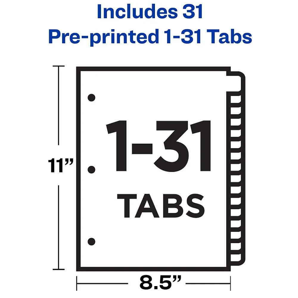 - Dividers feature 31 tabs labeled numerically from 1 to 31