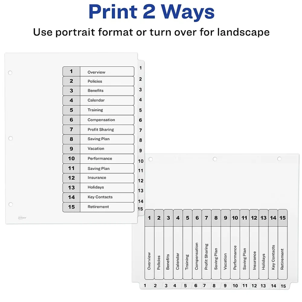 Organize your documents quickly and easily with our Customizable Table of Contents Dividers. No tab inserts or labels are needed. The double-sided section titles page and tab dividers provide flexibility to use in portrait or landscape format. The tabs feature 1 through 15 preprinted in black on white tabs. The heavyweight paper with double-sided reinforced holes and extended tab reinforcements provide added durability. The dividers are great for project binders, meeting materials, reference or training manuals, archiving and more.Easily customize your table of contents page with a logo, name, date or project title using the free templates and designs at avery.com/templates.