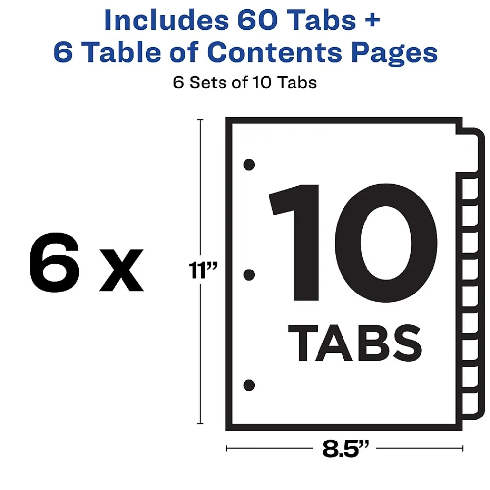 Organize your projects in moments with Avery Ready Index 10-tab dividers. Each tab is preprinted and uniquely color coded for a professional appearance. Print your own custom section titles and images onto the table of contents sheet without worrying about labels or inserts. Whether you’re creating planners for classes or hosting a presentation, these dividers are ideal for getting everything sorted.6 sets of 10 tabbed dividers are included with each sheet measuring 8-1/2″x11″. The 3 binder holes are reinforced on both sides of the heavyweight sheet to prevent creasing and tearing. Each divider tab includes additional reinforcement along the edge of each page to distribute stress and resist folding.The printable table of contents is dual compatible with both laser and inkjet printers. This sheet can also be printed in either portrait or landscape so that your projects can be displayed in any orientation. Just flip the sheet to view the other layout on the opposite side. Try out free templates for these dividers and check out the Avery Design & Print software at avery.com/templates.