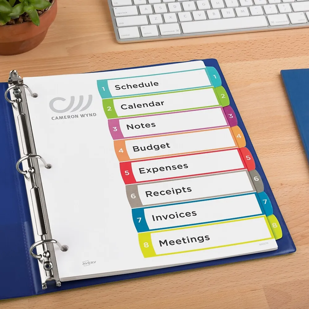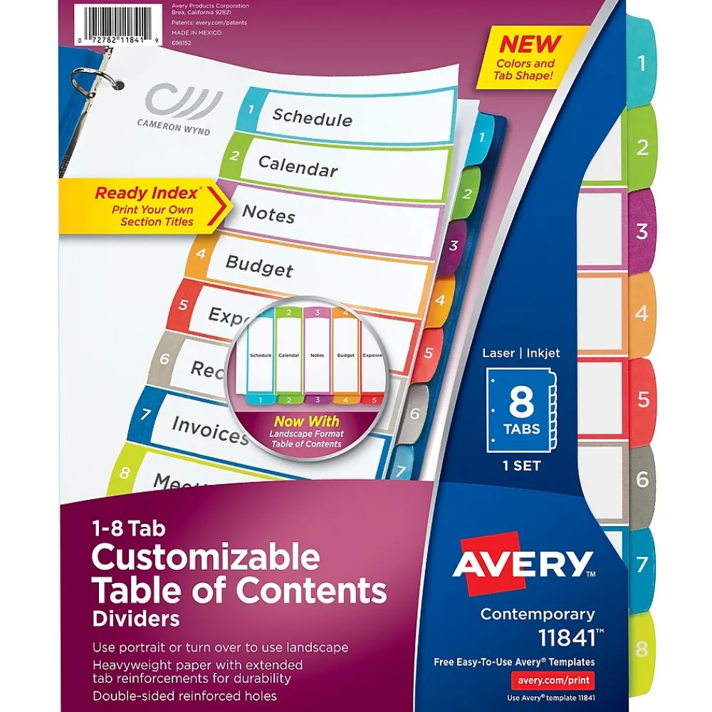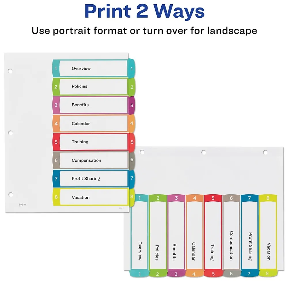 Give your binders a refreshing new look with Avery Ready Index Dividers.Each divider tab features a bright, contemporary color scheme with arched tabs. Print your own custom section titles and images onto the table of contents sheet without worrying about labels or inserts. Whether you’re creating planners for classes or hosting a presentation, these dividers are ideal for getting everything sorted.8 tabbed dividers are included with each sheet measuring 8-1/2″x11″. The 3 binder holes are reinforced on both sides of the heavyweight sheet to prevent creasing and tearing. Each divider tab includes additional reinforcement along the edge of each page to distribute stress and resist folding.The printable table of contents is dual compatible with both laser and inkjet printers. Try out free templates for these dividers and check out the Avery Design & Print software at avery.com/templates.