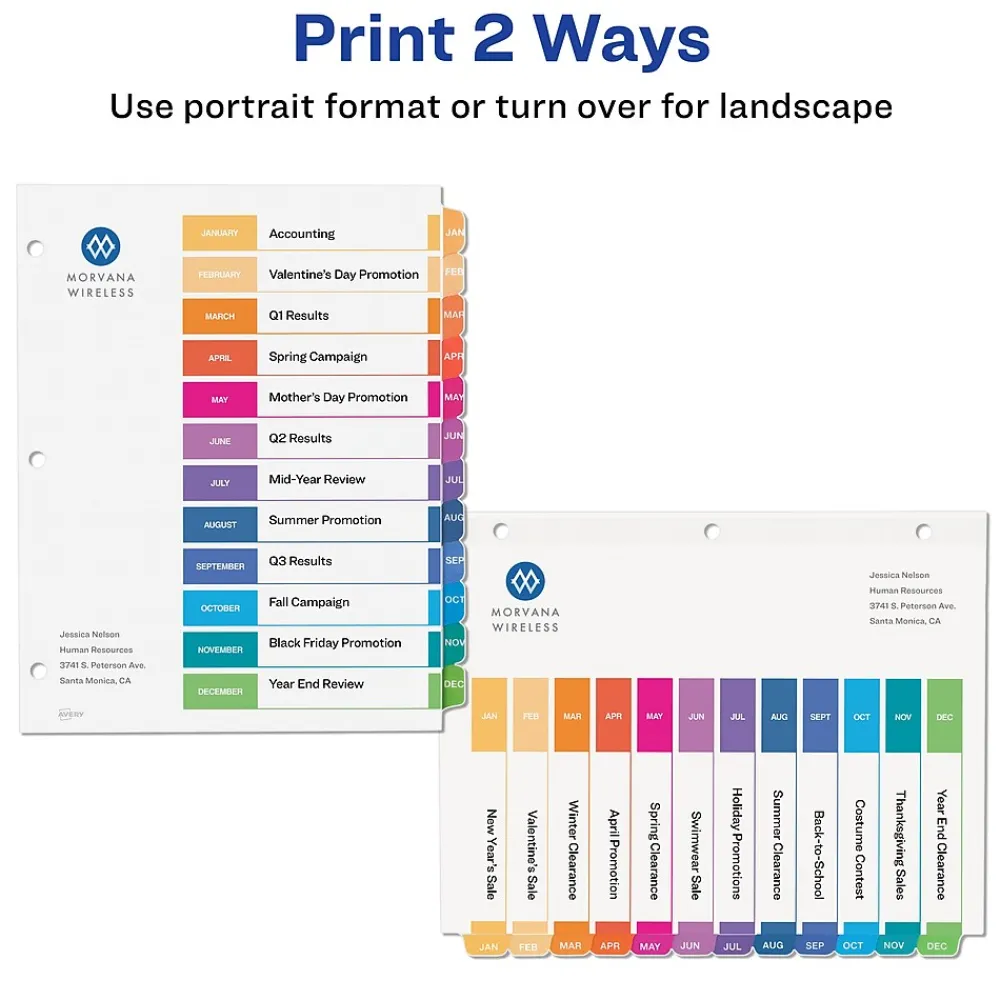 Organize your projects in moments with Avery Ready Index monthly binder dividers.Each tab is preprinted and uniquely color coded for a professional appearance.Print your own custom section titles and images onto the table of contents sheet without worrying about labels or inserts.Whether you’re creating planners for classes or hosting a presentation, these dividers are ideal for getting everything sorted.Monthly 12 dividers are included with each sheet measuring 8-1/2″x11″. The 3 binder holes are reinforced on both sides of the heavyweight sheet to prevent creasing and tearing. Each divider tab includes additional reinforcement along the edge of each page to distribute stress and resist folding.The printable table of contents is dual compatible with both laser and inkjet printers. This sheet can also be printed in either portrait or landscape so that your projects can be displayed in any orientation. Just flip the sheet to view the other layout on the opposite side. Try out free templates for these dividers and check out the Avery Design & Print software at avery.com/templates.