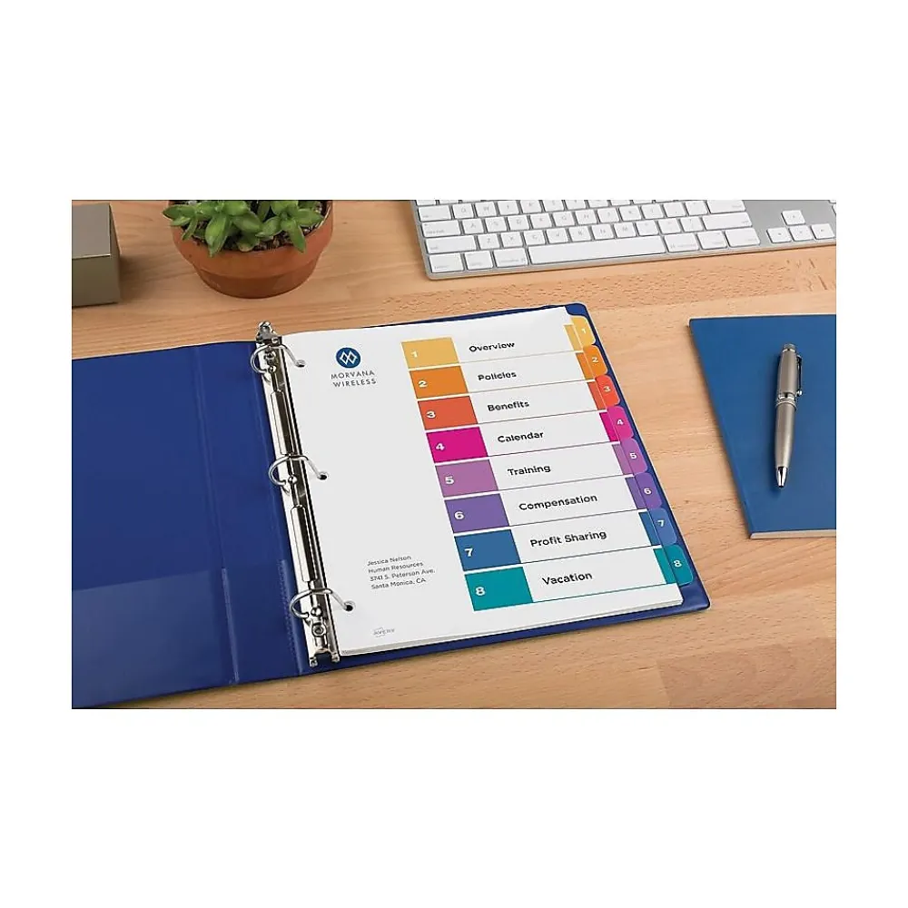 Organize your projects in moments with Avery Ready Index 8-tab dividers. Each tab is preprinted and uniquely color coded for a professional appearance. Print your own custom section titles and images onto the table of contents sheet without worrying about labels or inserts. Whether you’re creating planners for classes or hosting a presentation, these dividers are ideal for getting everything sorted.6 sets of 8 tabbed dividers are included with each sheet measuring 8-1/2″x11″. The 3 binder holes are reinforced on both sides of the heavyweight sheet to prevent creasing and tearing. Each divider tab includes additional reinforcement along the edge of each page to distribute stress and resist folding.The printable table of contents is dual compatible with both laser and inkjet printers. This sheet can also be printed in either portrait or landscape so that your projects can be displayed in any orientation. Just flip the sheet to view the other layout on the opposite side. Try out free templates for these dividers and check out the Avery Design & Print software at avery.com/templates.