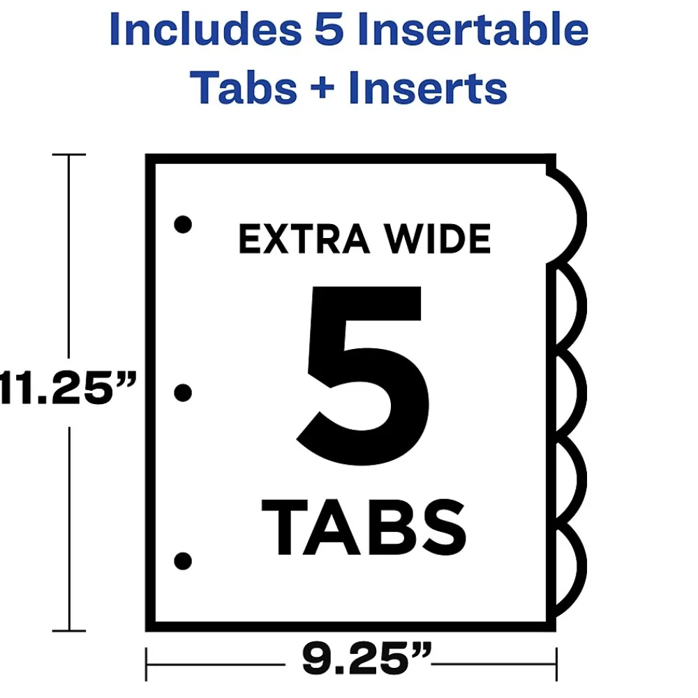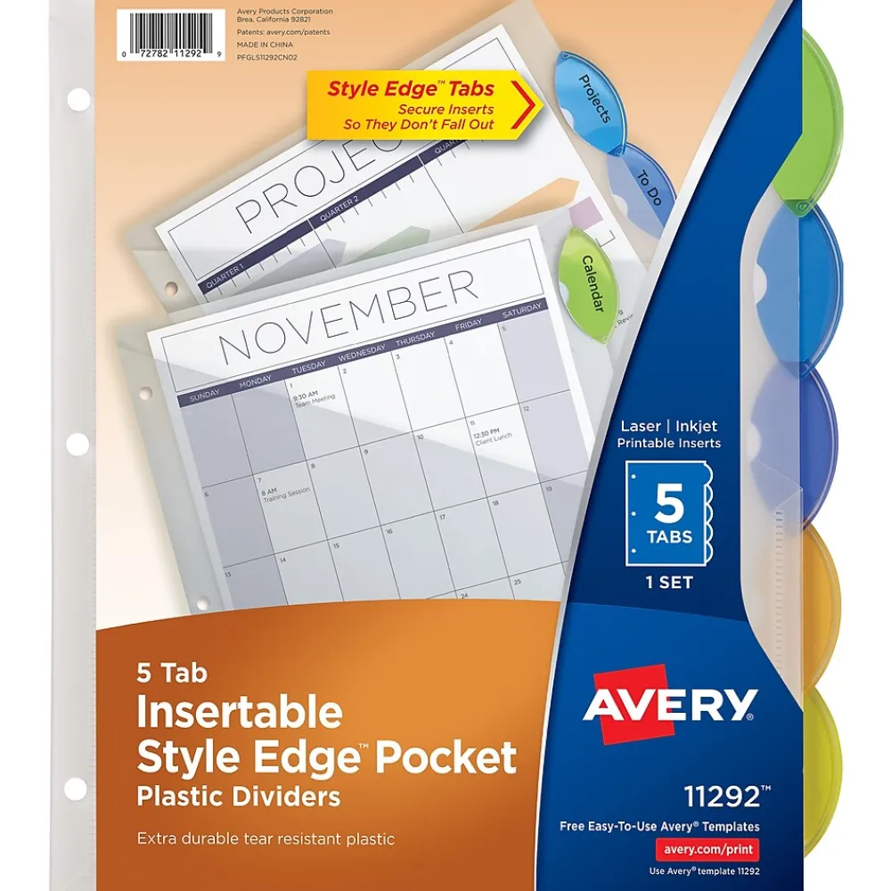 With these Insertable Style Edge Plastic Dividers with Pockets you get a fashionable look, easy referencing and extra storage all in one. The wide design works perfectly with sheet protectors so that you can still view your tabs at a glance. Each binder divider with tabs is made of durable, tear-resistant PVC-free plastic, ideal for 3-ring binders with frequently referenced documents. Style Edge divider tabs give your dividers a modern look with a unique oval tab shape and are designed to keep your inserts locked in during use, while the sturdy pockets can be used for storing loose papers. Sturdy and built to withstand everyday use, this set of translucent 5-tab binder dividers is great for organizing schoolwork, personal finances, recipes, coupons, sheet music, or anything else that needs sorting. These plastic dividers are 3-hole punched and ready for immediate use. For a clean, professional look, personalize your page tab inserts using free templates, fonts and designs on the Avery site. Inserts are compatible with laser and inkjet printers.