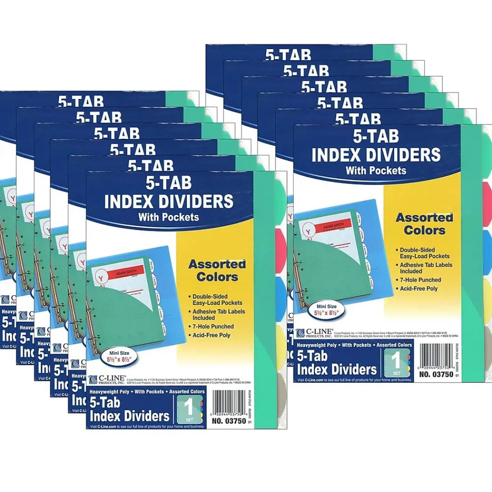 Although mini in size, this item has proved to offer large organizational benefits. Each set of dividers come in an colorful assortment of five dividers. The double-sided, easy-load slant pockets allow for extra storage of documents and media. Each set includes write-on tab labels to help identify the sections within the binder. The assortment of colors and storage options allows individuals to customize their binders to organize documents as they prefer. The versatile dividers are 7-hole punched, allowing them to fit in standard 3-ring 5.5 x 8.5, 6 x 9 or 8.5 x 11 binders. On-the-go organization is easy with C-Line’s document storage additions! Note: If using a day planner, please check the actual product dimensions and hole punch configuration; does not work with all day planner systems. Each set includes 5 dividers. Sold as 12 sets.