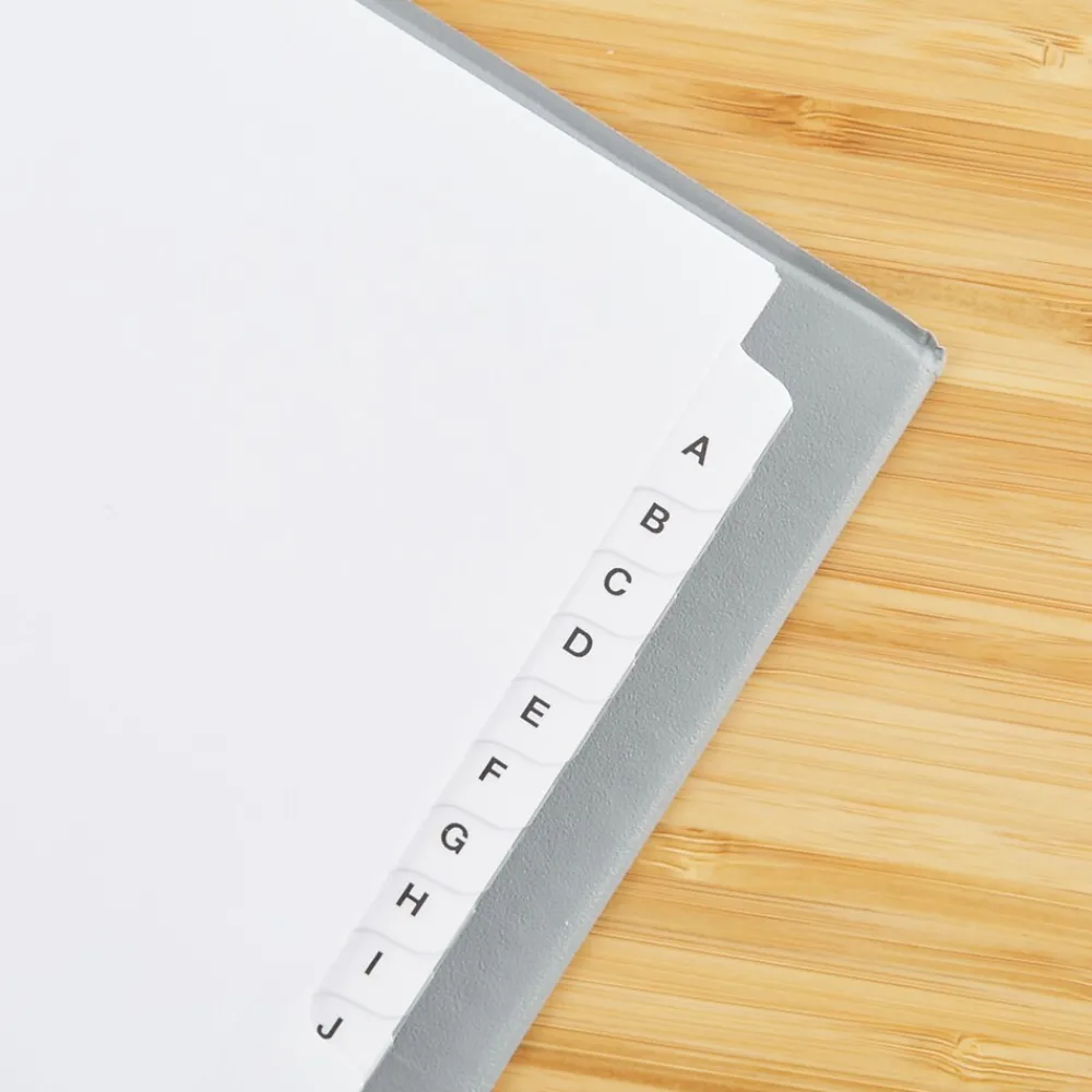 - Index divider size: 11″ x 8 1/2″, 27 tabs per set