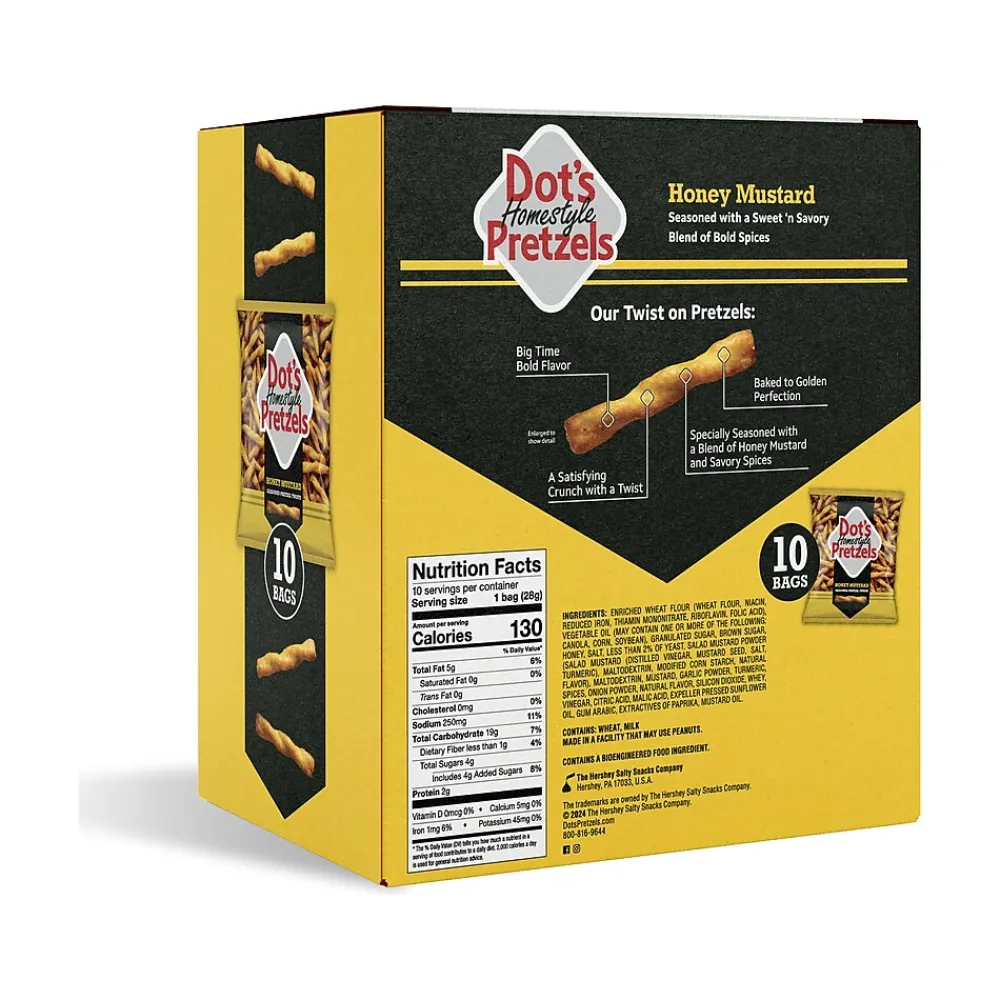 These Dots Homestyle Honey Mustard seasoned twist pretzels bring you a sweet and savory blend of bold spices. The honey wheat pretzels are baked to golden perfection with a satisfying crunch.