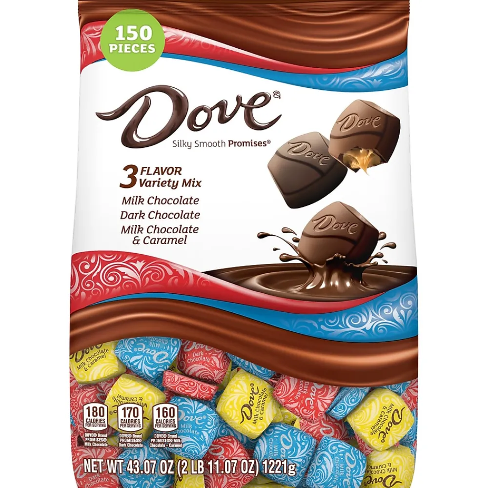 - Contains one (1) 43.07-ounce, 153-piece bag of DOVE PROMISES Dark Chocolate, Milk Chocolate, and Caramel Chocolate Candy Bulk Variety Pack