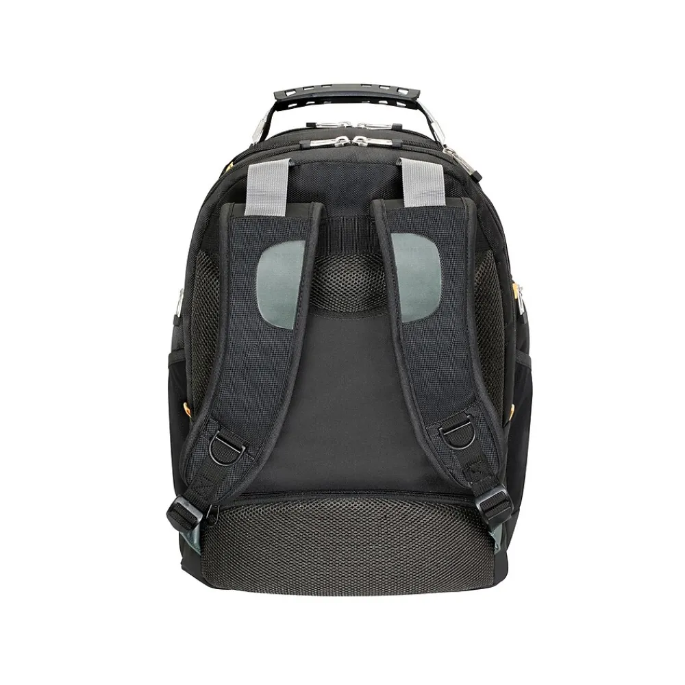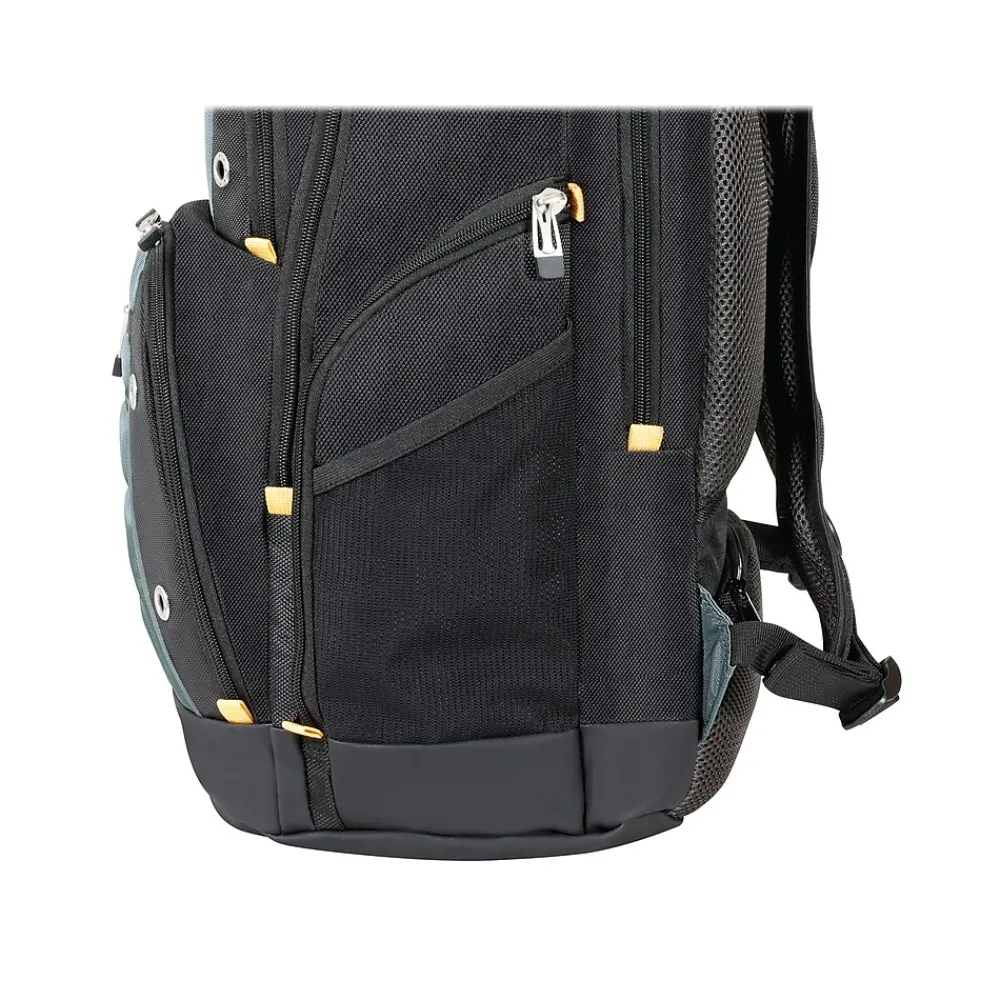 The Targus Drifter II laptop backpack is designed to fit laptops with screens up to 17″. This backpack features two large compartments for storage, including a padded laptop compartment that keeps the device secure and separate from other items carried in the case. The extremely thick padding on the back panel includes a large hidden zippered compartment and is strategically placed to provide lumbar support for your back. The heavily padded shoulder straps provide comfort for travel and include a removable mobile phone pocket as well as an elastic loop specifically designed to hold sunglasses on the shoulder strap. The main front compartment includes pockets for business cards, a mesh accessory pocket, and key clip. A convenient and soft lined pocket is scratch-resistant to store fragile accessories, such as glasses, and more. To keep files in order, the interior divider provides a safe place to store documents. Focusing on durability, the Drifter II backpack features a weather-resistant bottom, thick industrial zipper pulls, and a sturdy molded plastic handle supported by metal grommets and cabling. The backpack offers a rugged case full of storage options and protective compartments for important devices.