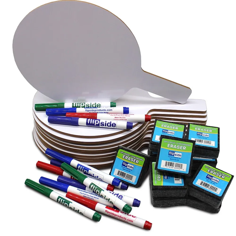 Quick and quiet whole class participation made easy with the Flipside dry-erase class set. Great for review sessions, surveys, assessments, and more. Writes on and wipes off easily. The Flipside dry-erase set includes 12 paddles, 12 erasers, and 12 colored pens.