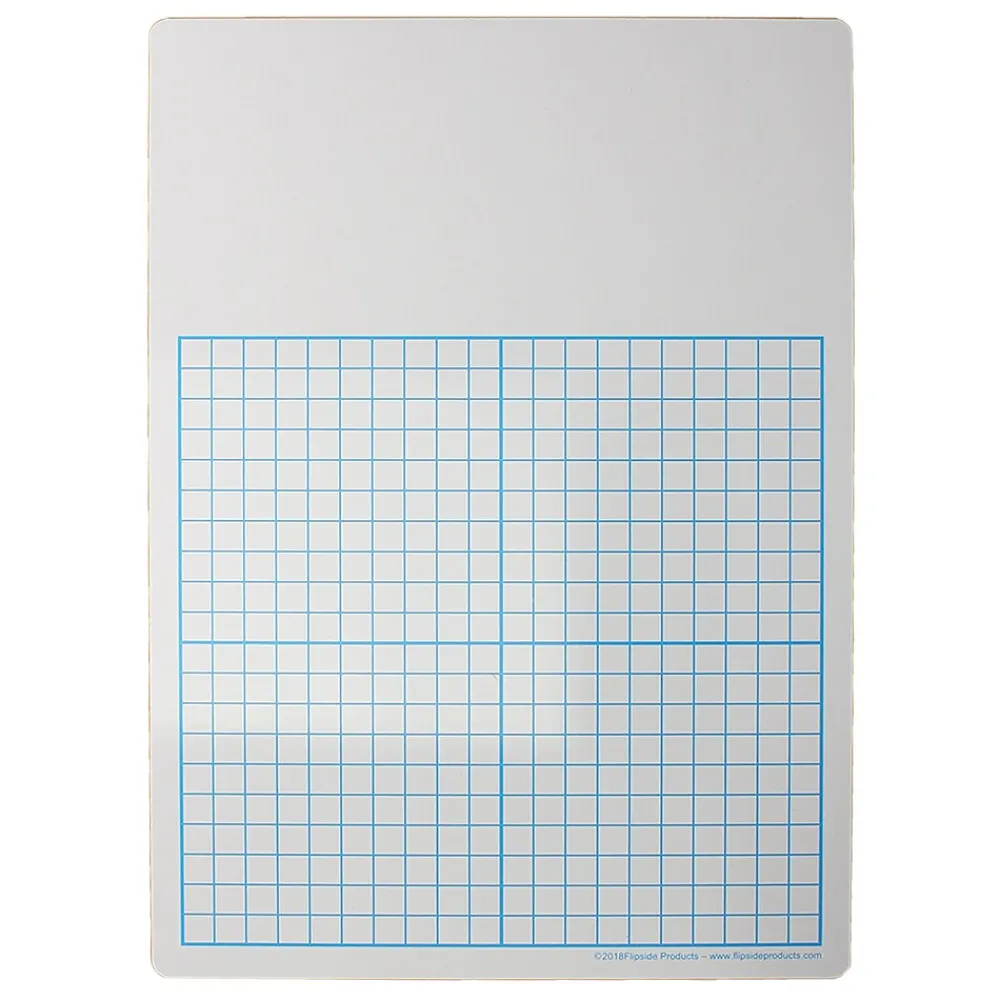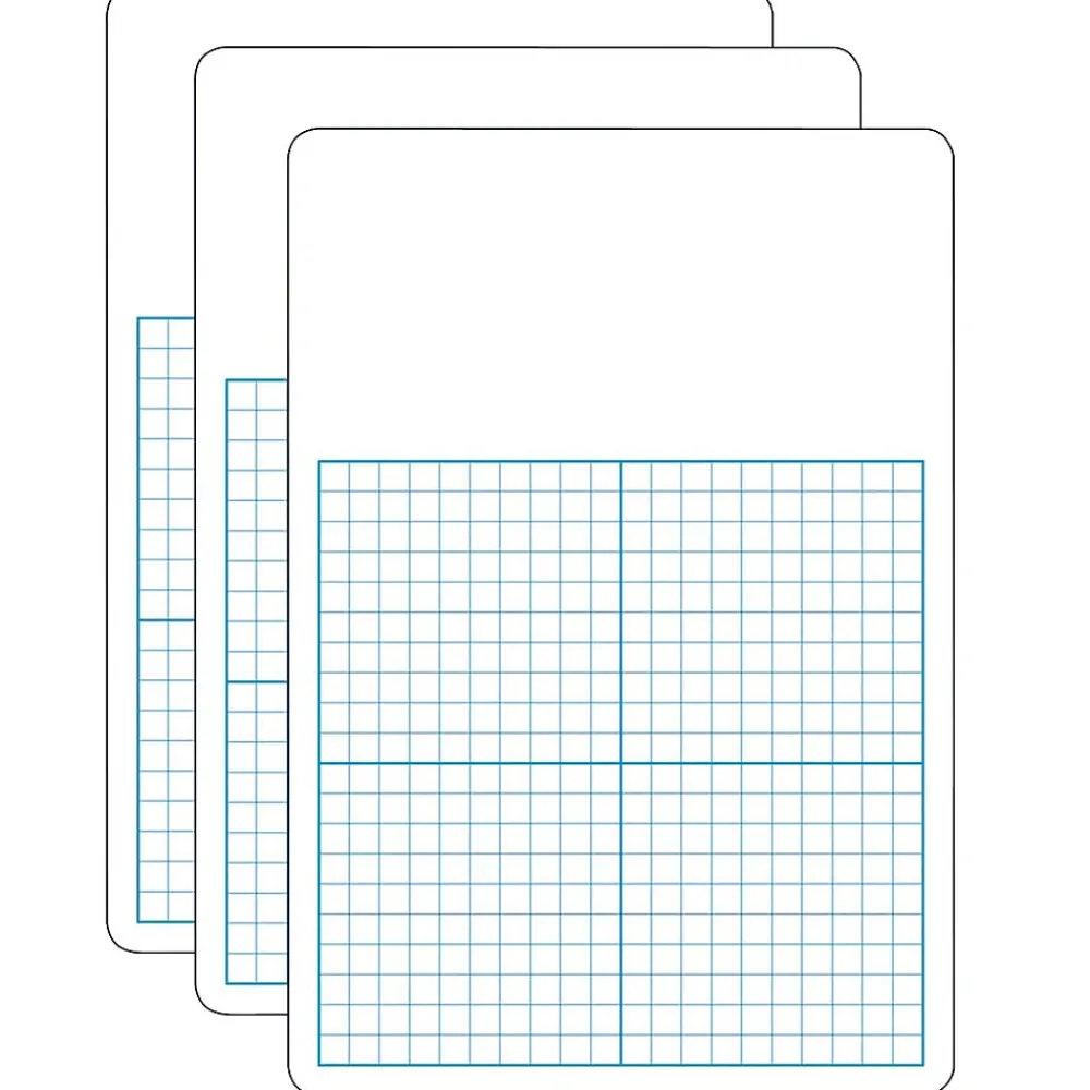 Graphing practice on dry erase boards saves paper! Bold lines separate board into quadrants each 10 squares by 10 squares; total grid is 20 squares by 20 squares. Individual squares measure 1/2″ x 1/2″. Plain work space is 11″ x 5-1/4″. Boards feature non-ghosting dry erase surface with rounded corners and smooth edges for safety and comfort. Durable hardboard backing is warp and chip resistant. Measure 11″ x 16″ x 0.125″. Sold as a pack of 3 boards.