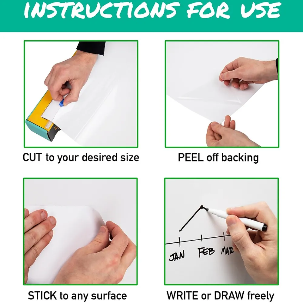 Boost productivity and organization with our adhesive and removable dry erase whiteboard roll. This versatile tool is perfect for offices, classrooms, and home management. Plan meals, make lists, set reminders, or maintain schedules with ease on this customizable surface.Ideal for study rooms and dorms, it supports focused study sessions and homework help. The package includes two markers in different colors for a clean writing experience, without residue. The built-in cutter lets you create a whiteboard of your desired size from the 24-inch by 10-foot roll.Applying and reusing the whiteboard is effortless and damage-free, making it adaptable to various settings. Use it for gatherings, game nights, or community events. A great gift for the organized, bosses, coworkers, teachers, and busy households, this whiteboard roll enhances planning and organization.Elevate productivity and organization with this customizable dry erase whiteboard roll, transforming your workspace and activities.