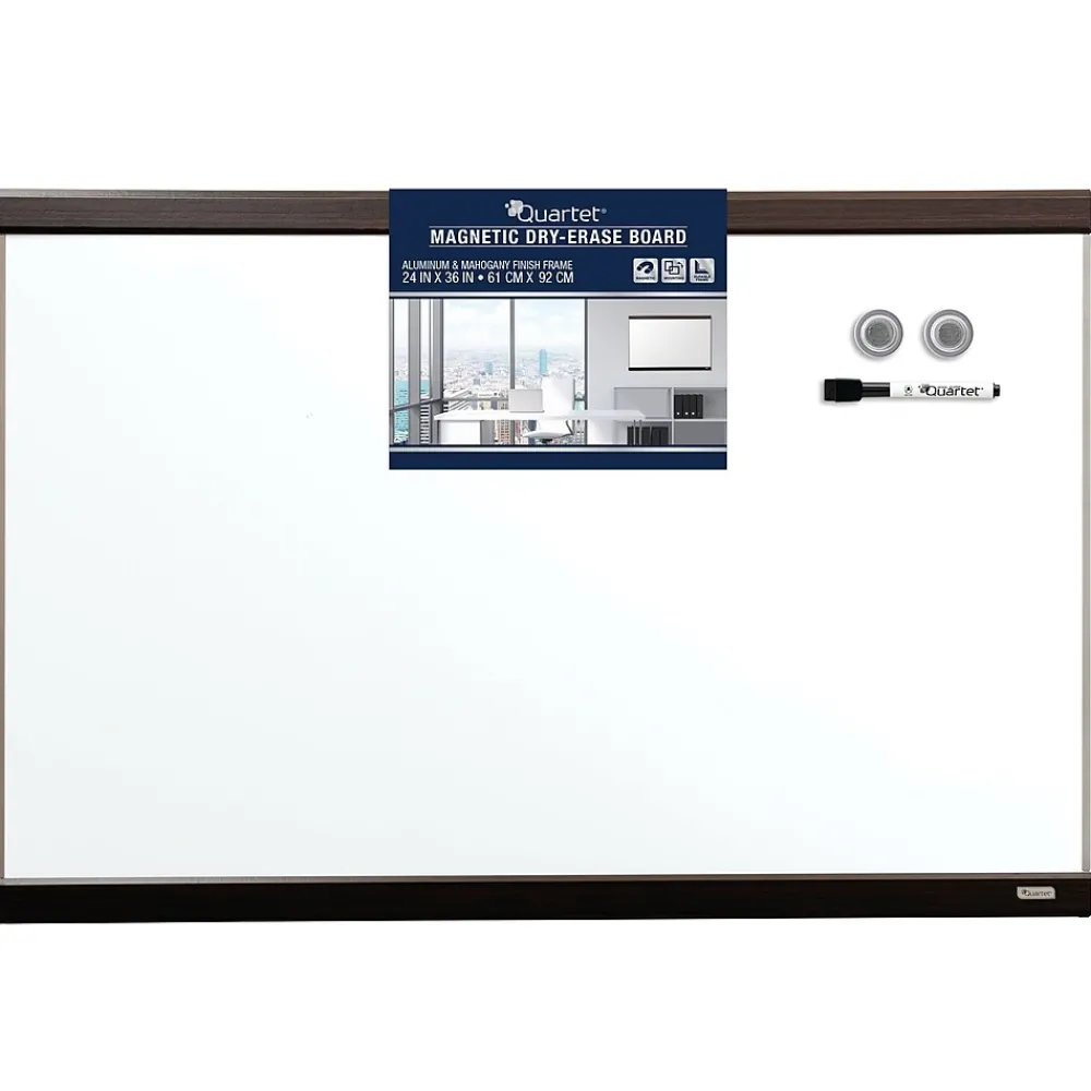 Quartet Magnetic dry-erase board with mahogany finish and aluminum frame measures 2′ x 3′ and is ideal for home office, cubicles or small spaces. Whiteboard quickly secures documents with the included quick clips.