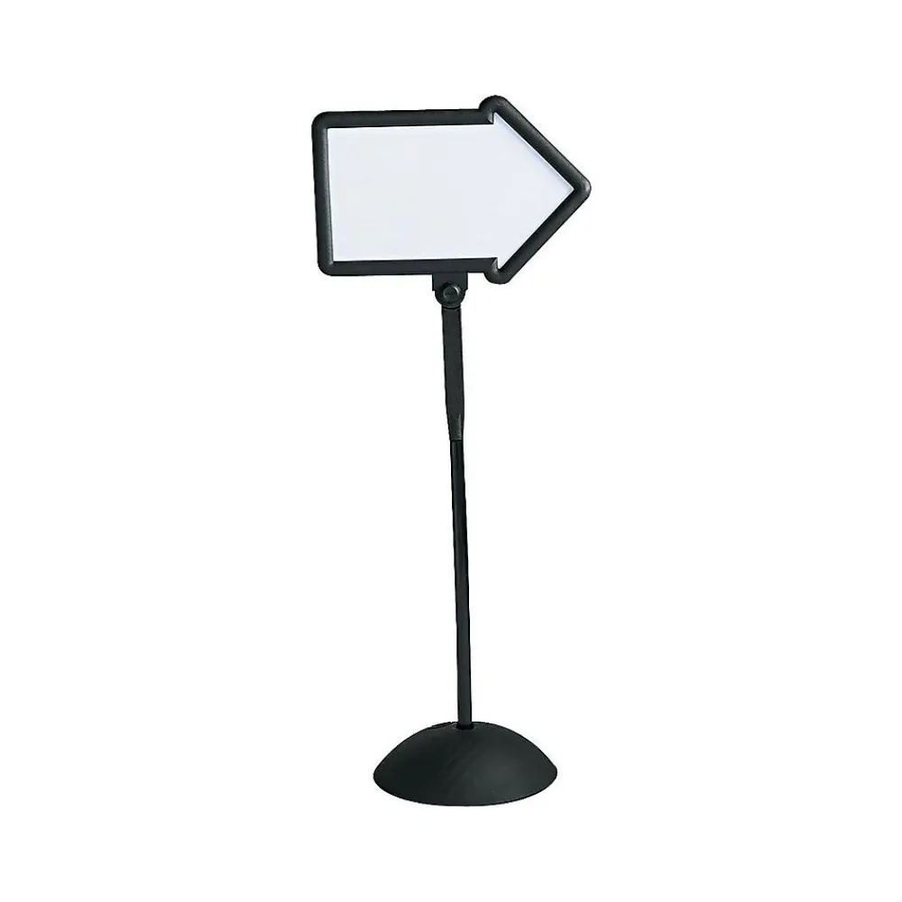 The sign features dual-sided dry-erase boards. The wide base of the sign can be weighted with water or sand for stability. The arrow can be positioned up, down, left, or right. Molded construction and UV inhibitors protect the sign when used outdoors, and black frame with white magnetic writing surface create a professional look.