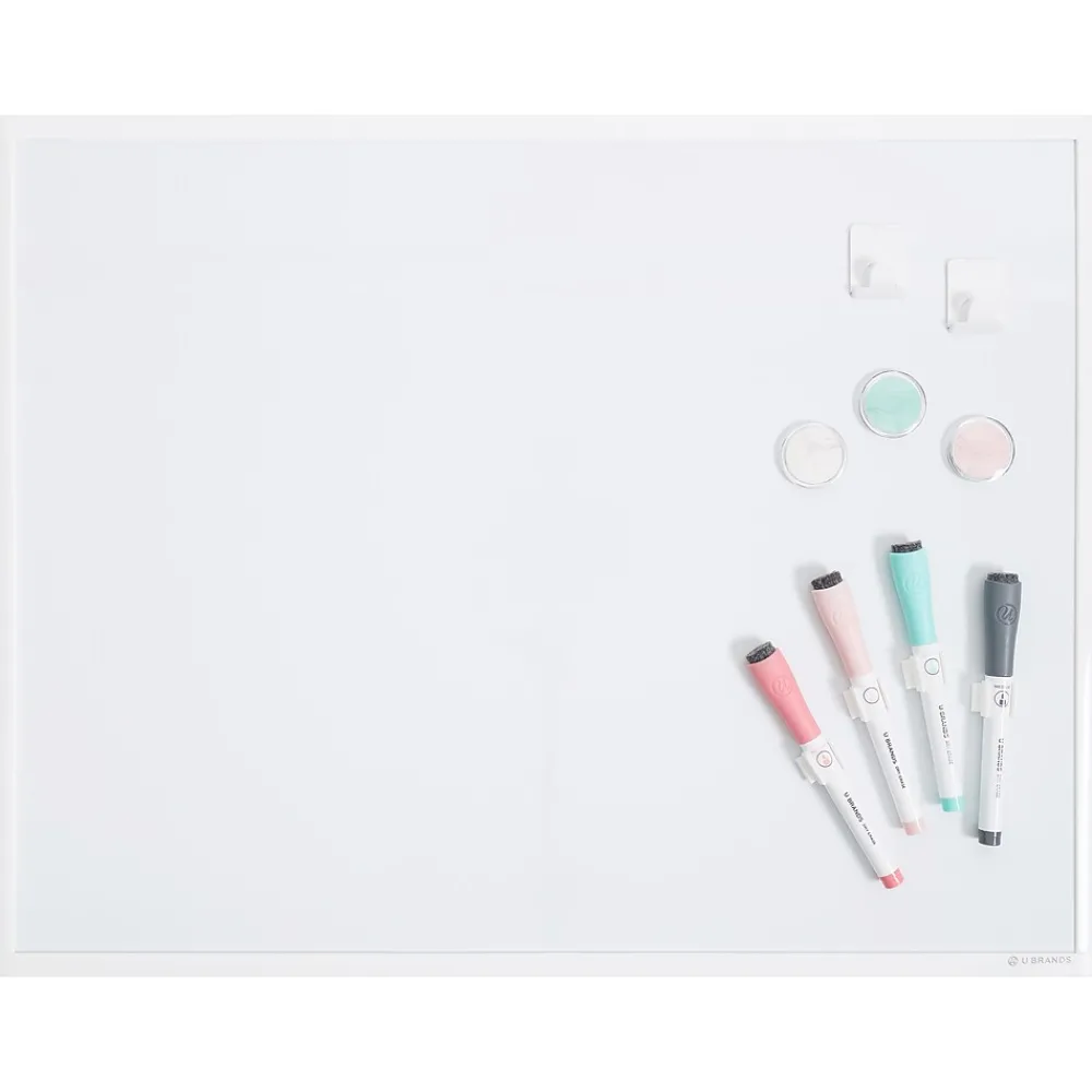 The U Brands 17″ x 23″ plastic frame magnetic dry-erase board brings a clean, modern profile to a classic whiteboard. Featuring a premium magnetic surface and framed in durable plastic, this board works as a blank canvas to jot notes and ideas or simply a place for creative design. The pack includes everything needed to personalize your board. Dry-erase markers with built-in erasers keep the board clean and bright, and marble printed magnets allow the board to do double duty as a bulletin board. Whether it’s a functional way to keep life on track or a place for doodling, you can’t go wrong with this essential board. So jot down your plans, let your family and friends know what’s cooking, or just get creative the old school way.
