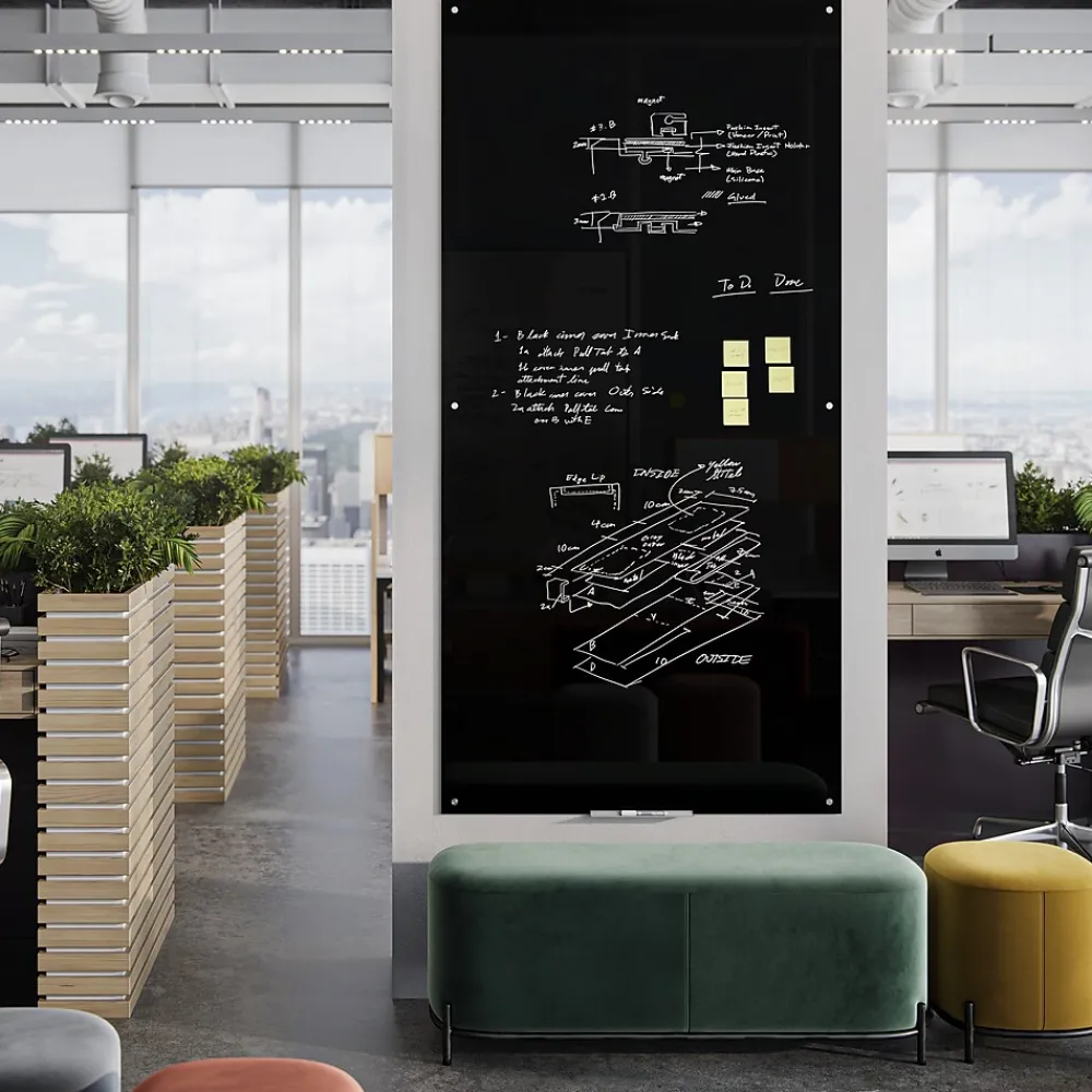 This U Brands dry-erase whiteboard features black glass surface and works great with U Brands liquid glass markers.