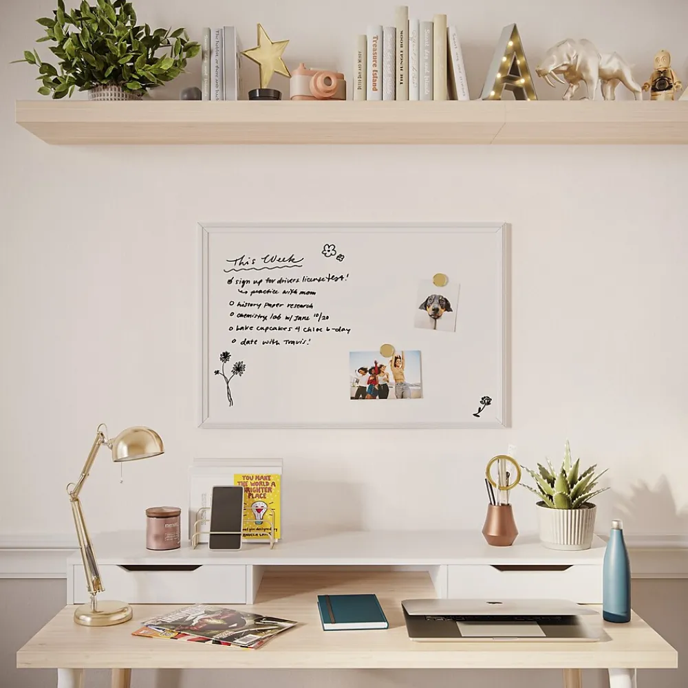 Enhance your workspace with our vibrant and versatile White Wood Style Frame Magnetic Dry Erase Board. This modern take on the classic whiteboard brings a fresh profile to your office, classroom, or home. With a generous 30″x20″ size, it is ideal for any setting. The premium magnetic surface, complete with included marker and magnet, provides a blank canvas for notes, ideas, or creative designs. Stains and ghosting won’t stand a chance on this high-quality surface, ensuring a clean slate every time. Mounting is effortless with included hardware and instructions, so you can start brainstorming, organizing, and sharing in no time. Designed to work flawlessly with any dry erase markers. However, you can maximize your board’s potential with U Brands dry erase markers. For your convenience, the board comes with two magnets. Whether it is a tool for staying organized or a canvas for your creativity, this essential board won’t disappoint. Explore our stylish and fashion-forward product lines, including stationery, journals, writing tools, presentation boards, and desk organization solutions for your home, school, or office.