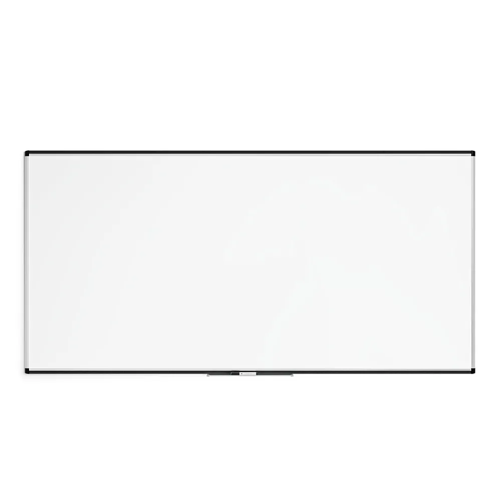 This U Brands PINIT whiteboard features painted magnetic steel dry-erase surface with built-in cork strip frame.