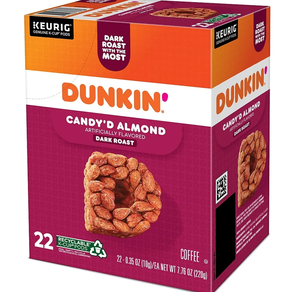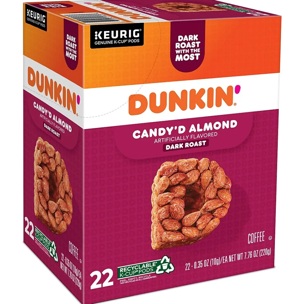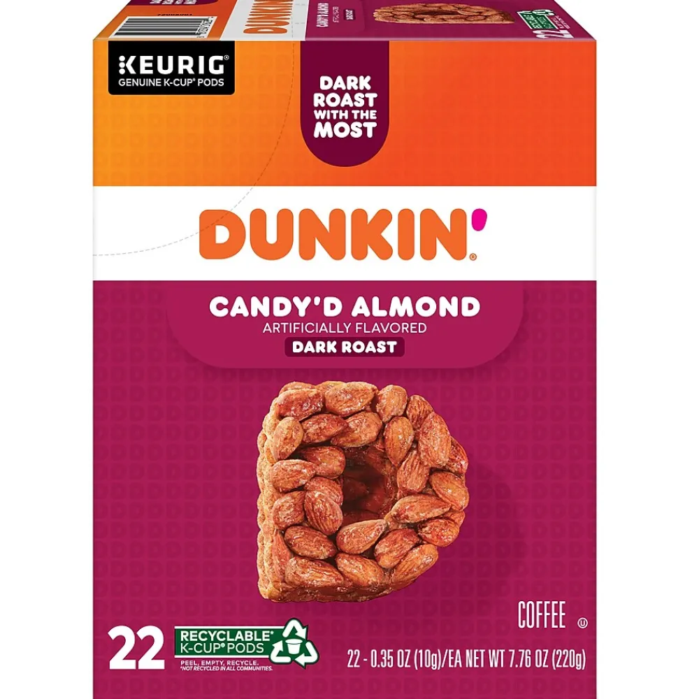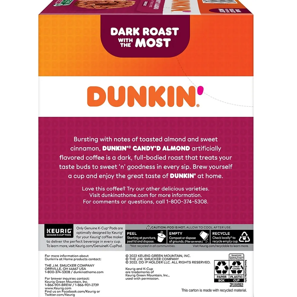 Bursting with notes of toasted almond and sweet cinnamon, the Dunkin’ Candy’d Almond artificially flavored coffee is a dark full-bodied roast that treats your taste buds to sweet and goodness in every sip. Brew yourself a cup and enjoy the great taste of Dunkin’ at home. Made with 100% arabica coffee, Orthodox Union Kosher certified, and compatible with all Keurig single-serve coffee makers. Comes in the Keurig recyclable K-Cup pod: simple, delicious, and recyclable. Enjoy the same great-tasting coffee you know and love, and when you’re done peel, empty, and recycle.