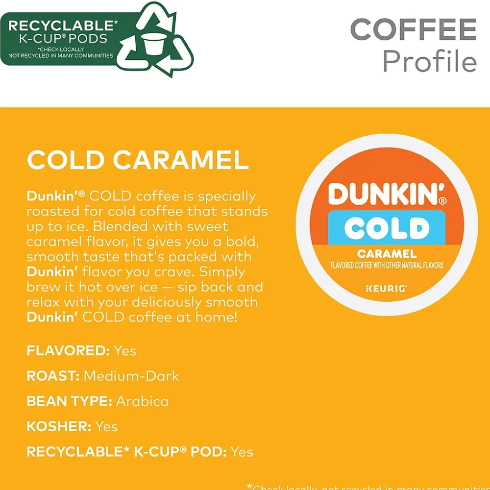 Dunkin’ Cold coffee is specially roasted for cold coffee that stands up to ice. Blended with sweet Caramel flavor, this pod gives you a bold, smooth taste that’s packed with the Dunkin’ flavor you crave. Simply brew it hot over ice, sip back, and relax with your deliciously smooth Dunkin’ Cold coffee at home. To prepare, simply fill a tumbler or mug about 0.75 of the way full with ice, and brew a K-Cup pod directly over it with your Keurig coffee maker (glass not recommended when pouring hot coffee directly over ice). Stir for at least 10 seconds and enjoy. Easy, convenient, and most importantly, delicious.