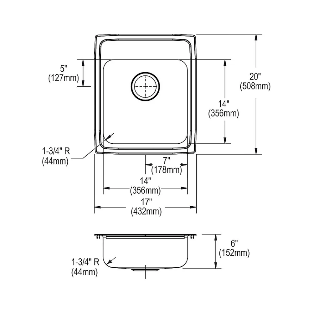 - Overall dimensions: 6″H x 17″W x 20″D; bowl dimensions: 5.88″H x 14″W x 14″D; sink drain opening measures 3.5″Dia.