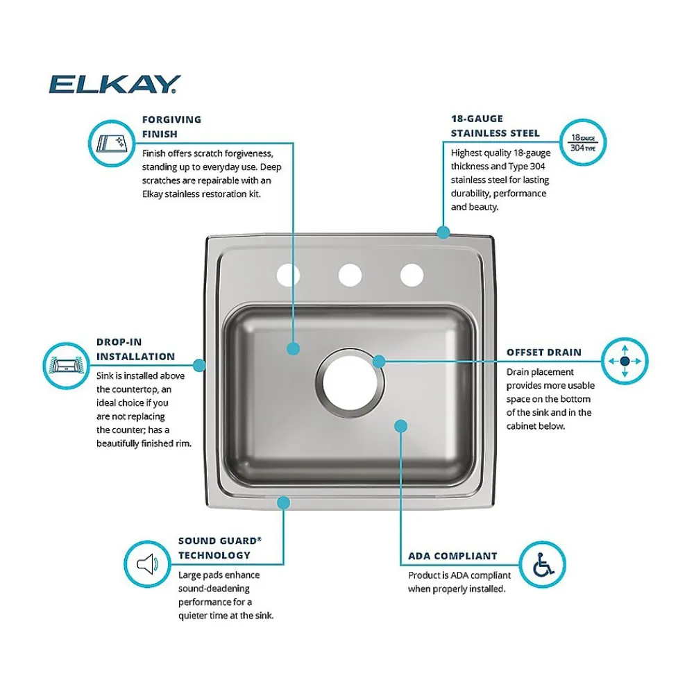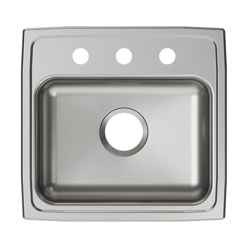 The Elkay Lustertone Classic stainless steel single-bowl drop-in sink with three faucet holes looks as great on day 3000 as it does on day one. The rich, uniform grain is scratch-resistant for heavy-duty use, whether it’s a kitchen sink or a prep, bar, laundry, or commercial sink. Light scratches, which occur with everyday use, naturally blend into the finish of this durable sink with time. Deeper scratches are repairable with the Elkay stainless steel restoration kit.