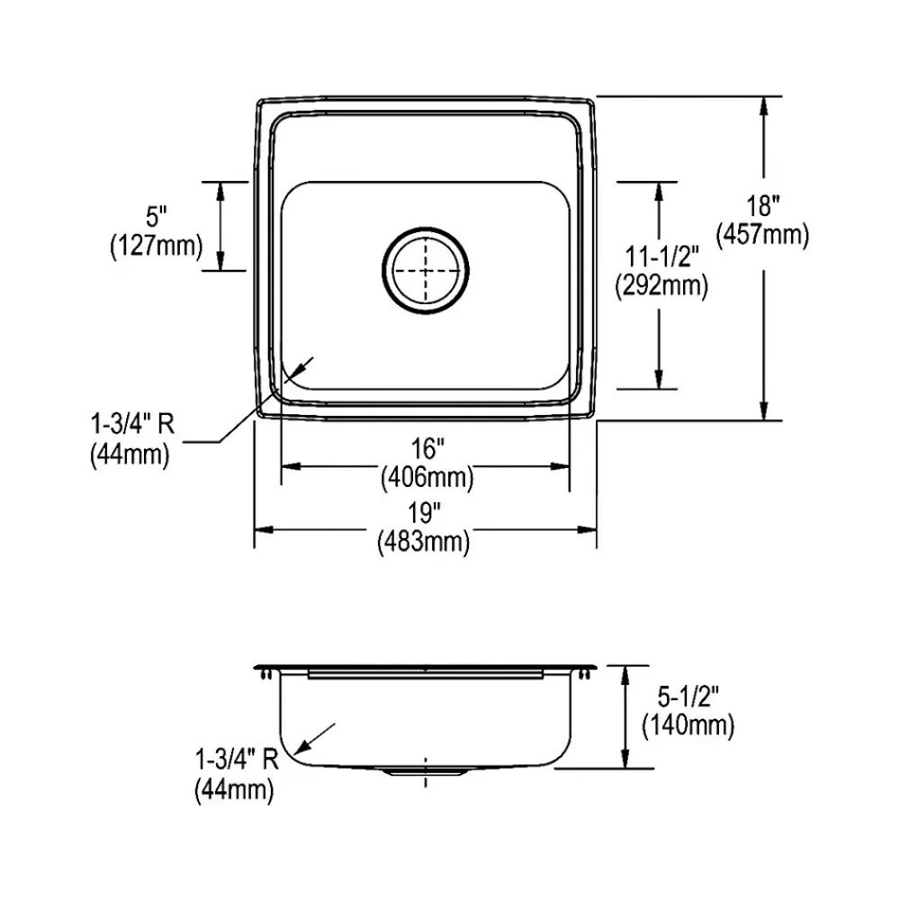 - Overall dimensions: 5.5″H x 19″W x 18″D; bowl dimensions: 5.38″H x 16″W x 11.5″D; sink drain opening measures 3.5″Dia.