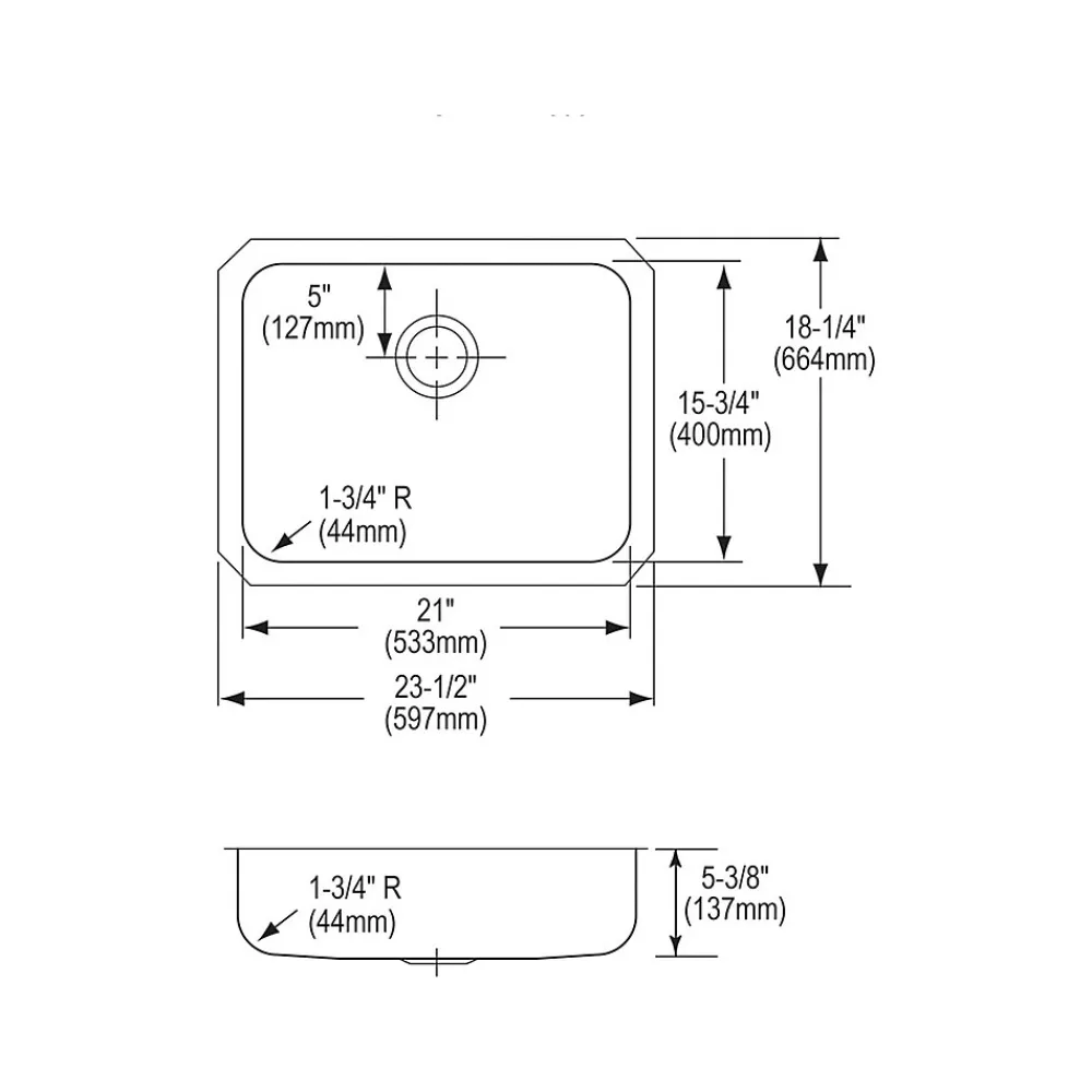 - Overall dimensions: 18.25″H x 23.5″W x 5.38″D; bowl dimensions: 15.75″H x 21″W x 5.38″D; sink drain opening measures 3.5″Dia.