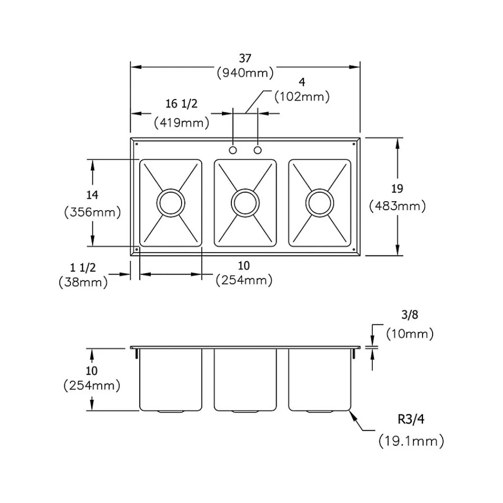 - Dimensions: 19″H x 37″W x 10″D; bowl dimensions: 14″H x 10″W x 10″D; drain opening measures 3.5″Dia.