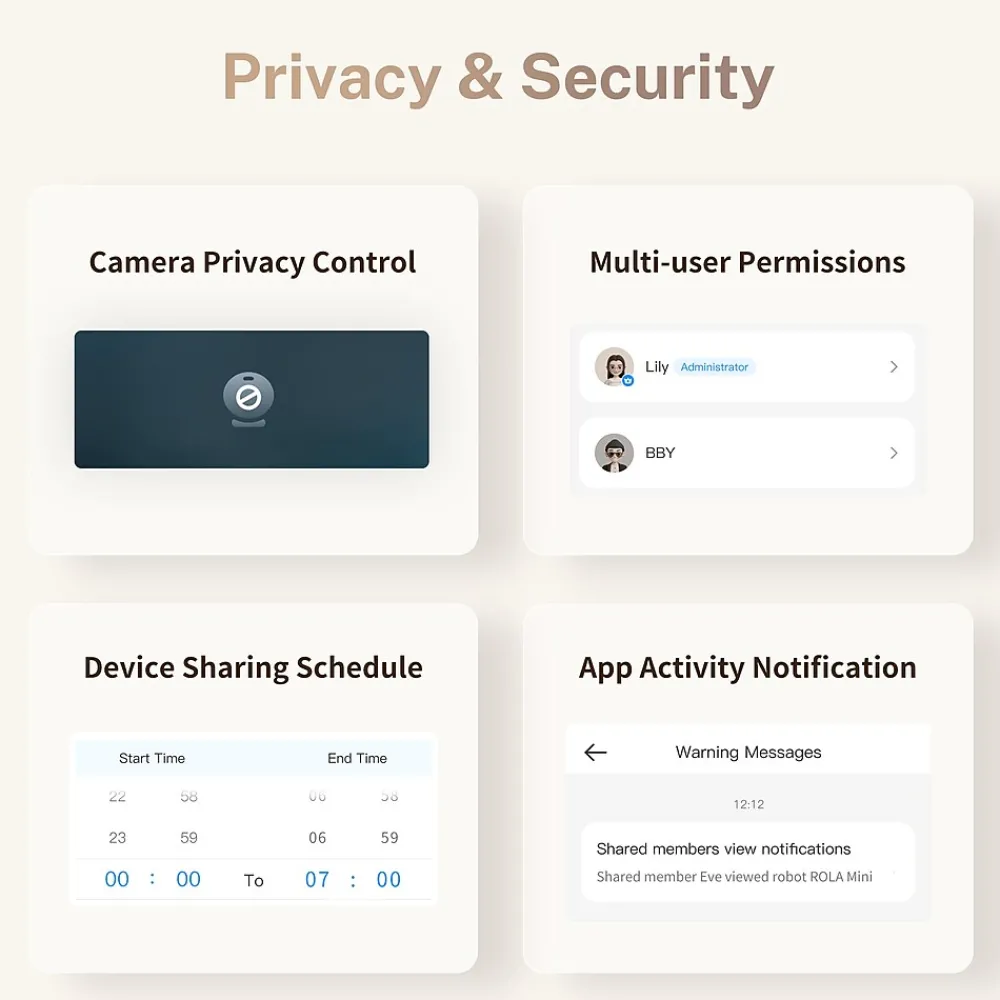 - Multi-users and Multiple Ways Protect Your Privacy: This pet camera supports many users to view simultaneously on iPhone and Android phone. No limit on the number of accounts. And there are 4 ways to protect your privacy by ROLA APP: Close the Camera, Close the Multi-user Permissions, Close the Device Sharing Schedule Customization and Close the Notification for App Control Activity