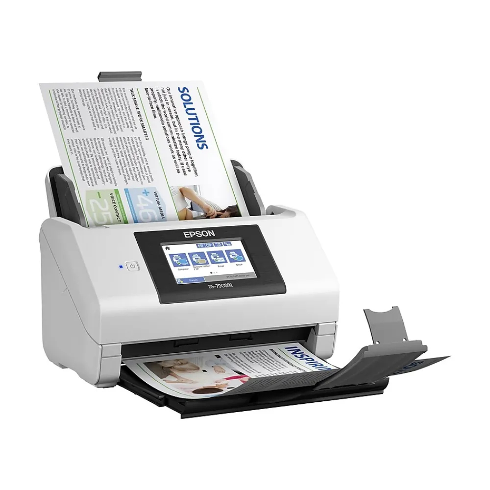 Fast, versatile and powerful, the DS-790WN combines network connectivity, enhanced security features and PC-free scanning so you can manage your business solutions with confidence. Designed for reliability plus ease of use, the DS-790WN delivers high-quality scans up to 45 ppm/90 ipm with a peak daily duty cycle up to 7,000 sheets, one-pass duplex scanning and a high-volume 100-page ADF that accommodates business and ID cards as well as extra-long pages up to 240 inches. The intuitive 4.3-inch color LCD touchscreen allows you to access multiple jobs and email or scan to a USB drive, your network or cloud storage services without the need for a computer. Gain full control of your documents with individual user authentication via the touchscreen or an optional card reader, including customizable scan settings and access to personal usage records. The DS-790WN enables efficient document management and integration to optimize your business – it includes both TWAIN and ISIS drivers for seamless integration with most existing enterprise software. With included OCR software, you can generate searchable PDF files as well as editable Office documents. Built-in LAN and Wi-Fi network connectivity allows for easy scanning, and you can scan with your mobile device using the Epson Smart Panel app on iOS or Android.