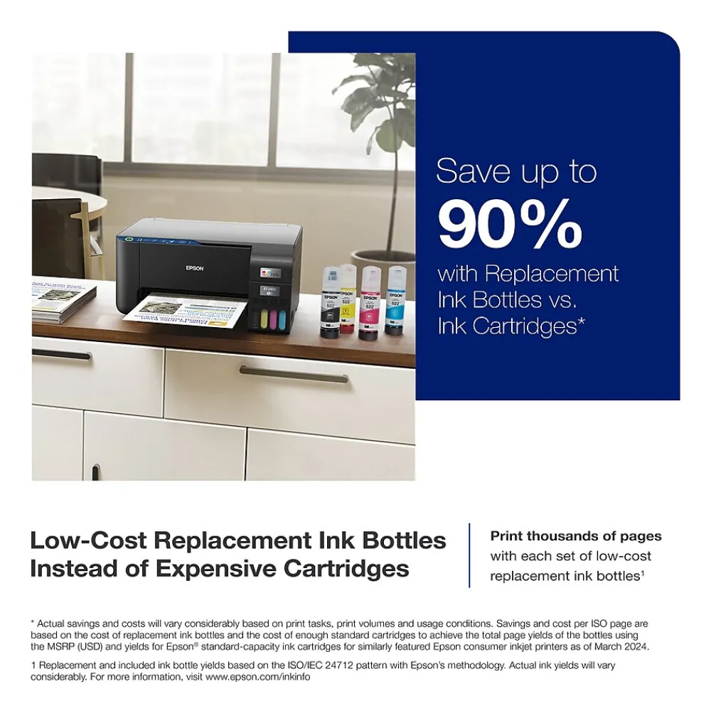 - High-Capacity Ink Tanks – Epson’s exclusive EcoFit ink bottles make filling easy and worry-free