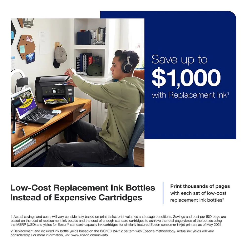 - High-Capacity Ink Tanks — Epson’s exclusive EcoFit ink bottles make filling easy and worry-free