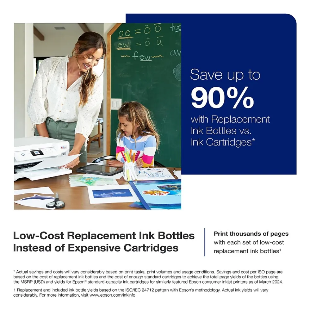 - Dramatic Savings on Replacement Ink ― Save up to 90% with replacement ink bottles vs. ink cartridges – that’s enough to print up to 7,500 pages black/6,000 color