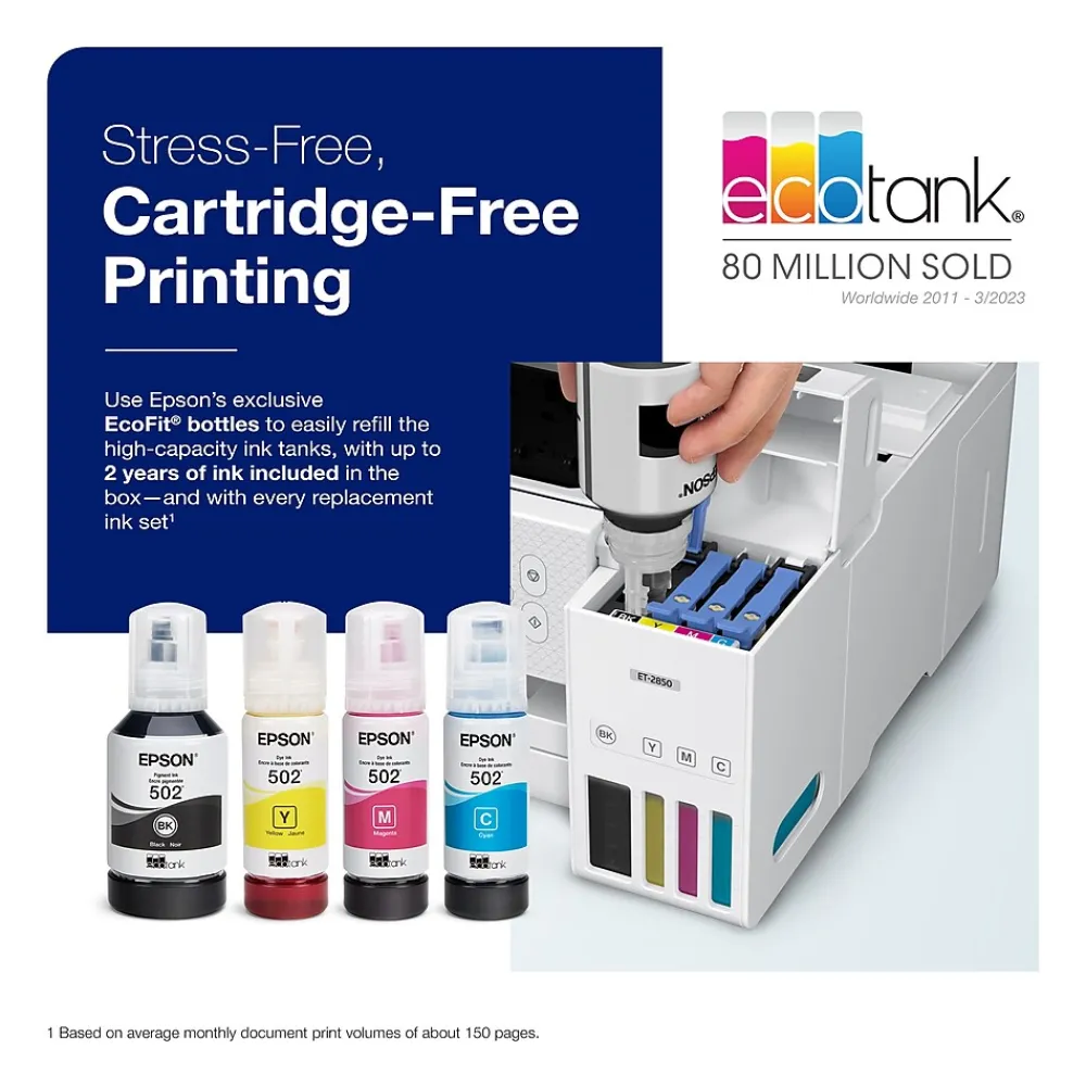 | Touch Screen Display | EcoTank ET-2850 all-in-one, manual, power cord, 1 bottle of 502 Black (127 mL) and 1 bottle each of 502 Cyan, Magenta, Yellow (70 mL) |