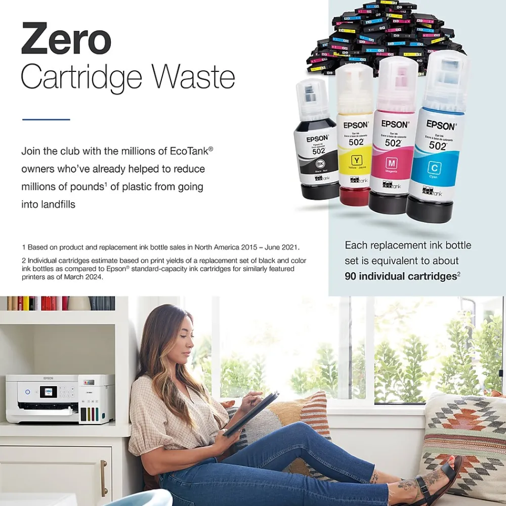 - Zero Cartridge Waste ― By using an EcoTank printer, you can help reduce the amount of cartridge waste ending up in landfills