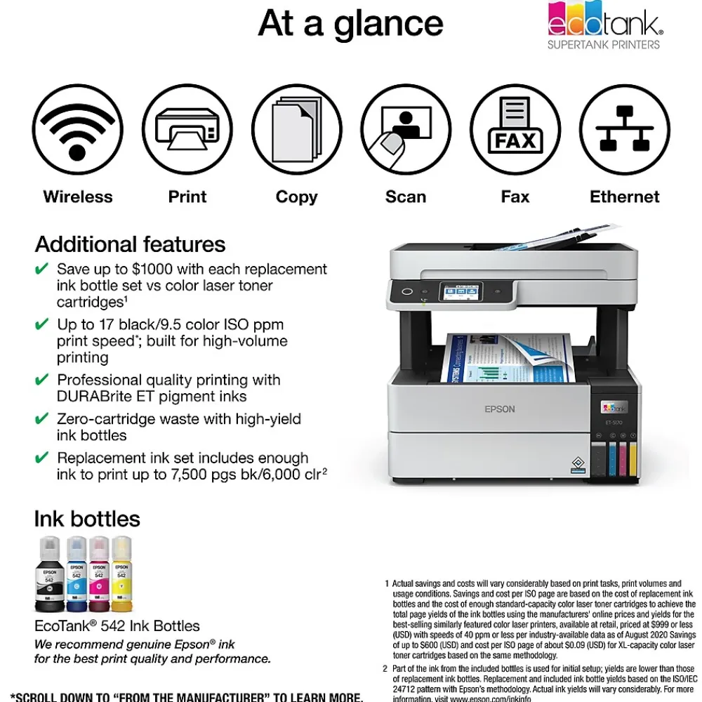Ideal for high-volume environments, the EcoTank Pro ET-5170 all-in-one Supertank printer offers fast Cartridge-Free Printing, plus copy, scan and fax. Save up to 80 percent with low-cost replacement ink bottles vs. standard-capacity color laser toner cartridges – that’s about 2 cents per color ISO page versus 14 cents with cartridges. Engineered for high productivity in a small footprint, the ET-5170 delivers professional-quality prints face down for greater privacy. Epson DURABrite ET pigment ink ensures vibrant prints. This hardworking printer offers demanding businesses reliability they can count on, including a 2-year limited warranty with registration and permanent printhead designed to last the life of the printer. Plus, there’s zero cartridge waste.
